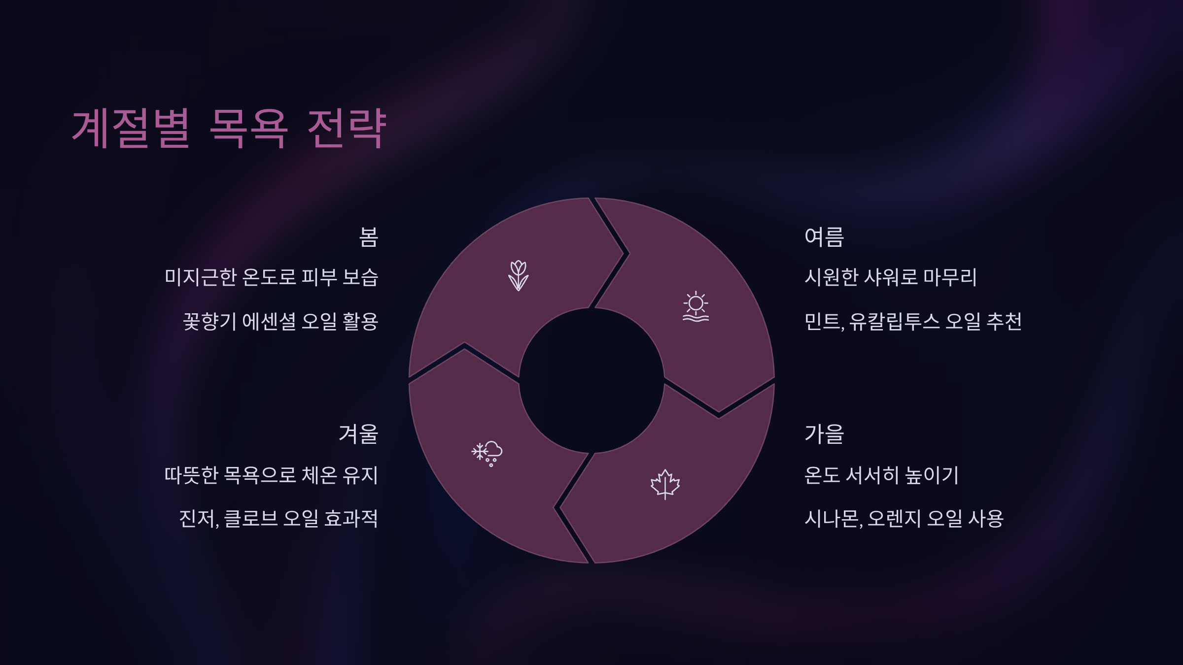 | 봄 | 37-38도 | 15분 | 카모마일, 라벤더 | 알레르기 관리 |
