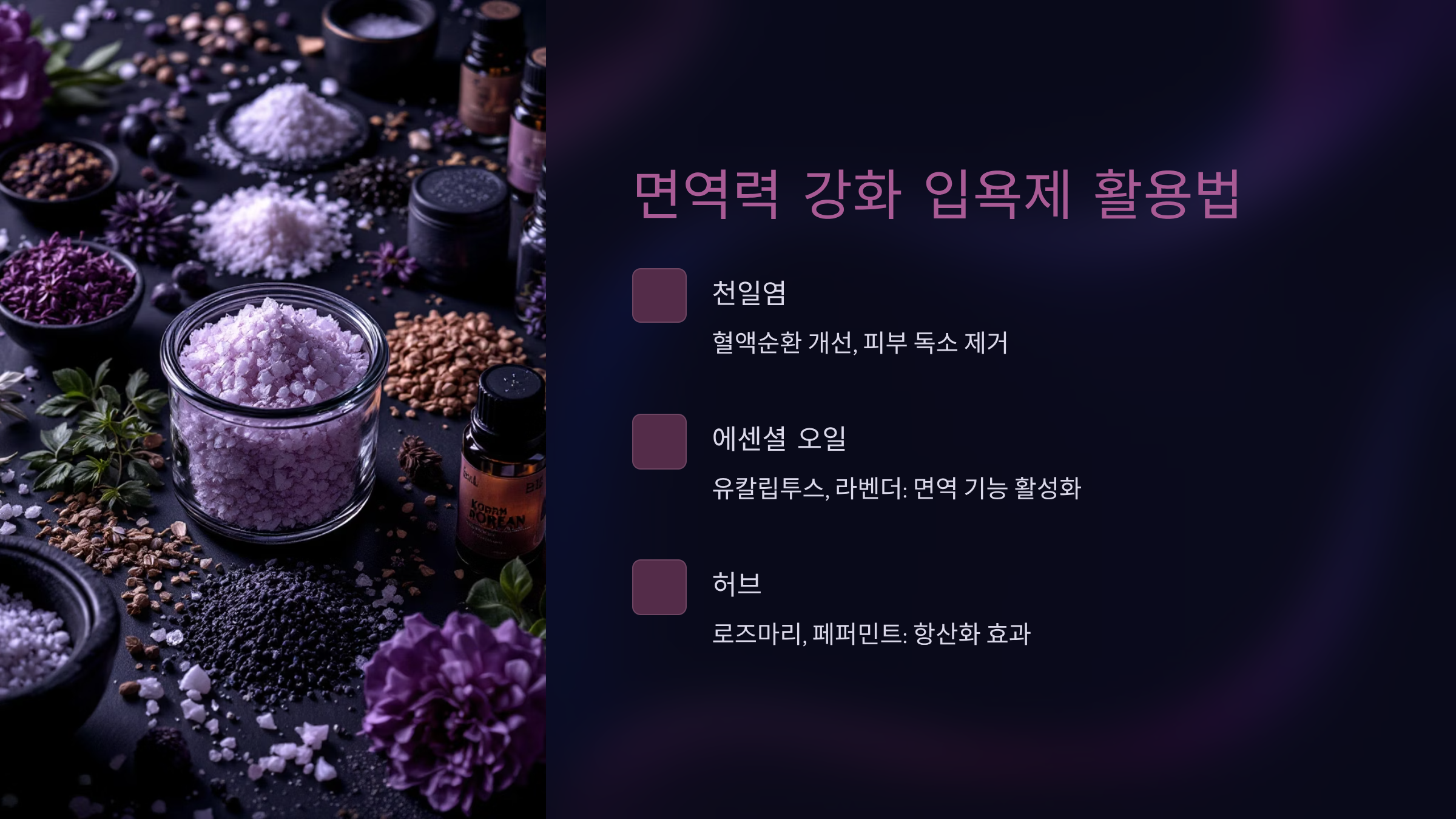 천연 입욕제는 목욕의 면역력 강화 효과를 배가시켜 줘요. 엡솜솔트(황산마그네슘)는 근육 이완과 독소 배출에 탁월한 효과가 있답니다. 따뜻한 물에 1-2컵 정도 녹여서 20분간 목욕하면 마그네슘이 피부를 통해 흡수되어 면역 세포 기능을 향상해요. 특히 운동 후나 스트레스가 많은 날에 효과적이에요.