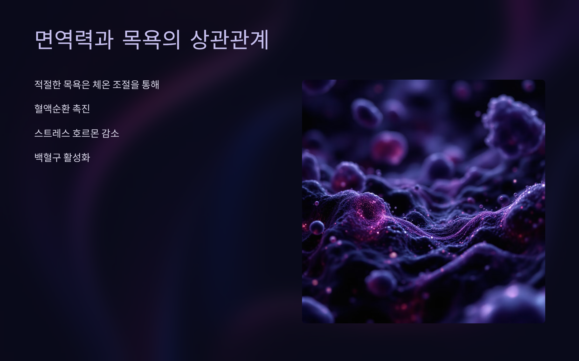 수면의 질 개선도 목욕이 면역력에 기여하는 중요한 부분이에요. 잠자기 1-2시간 전 목욕을 하면 체온이 서서히 떨어지면서 자연스럽게 수면 호르몬인 멜라토닌 분비가 촉진된답니다. 양질의 수면은 면역 시스템 회복과 재생에 필수적이에요.