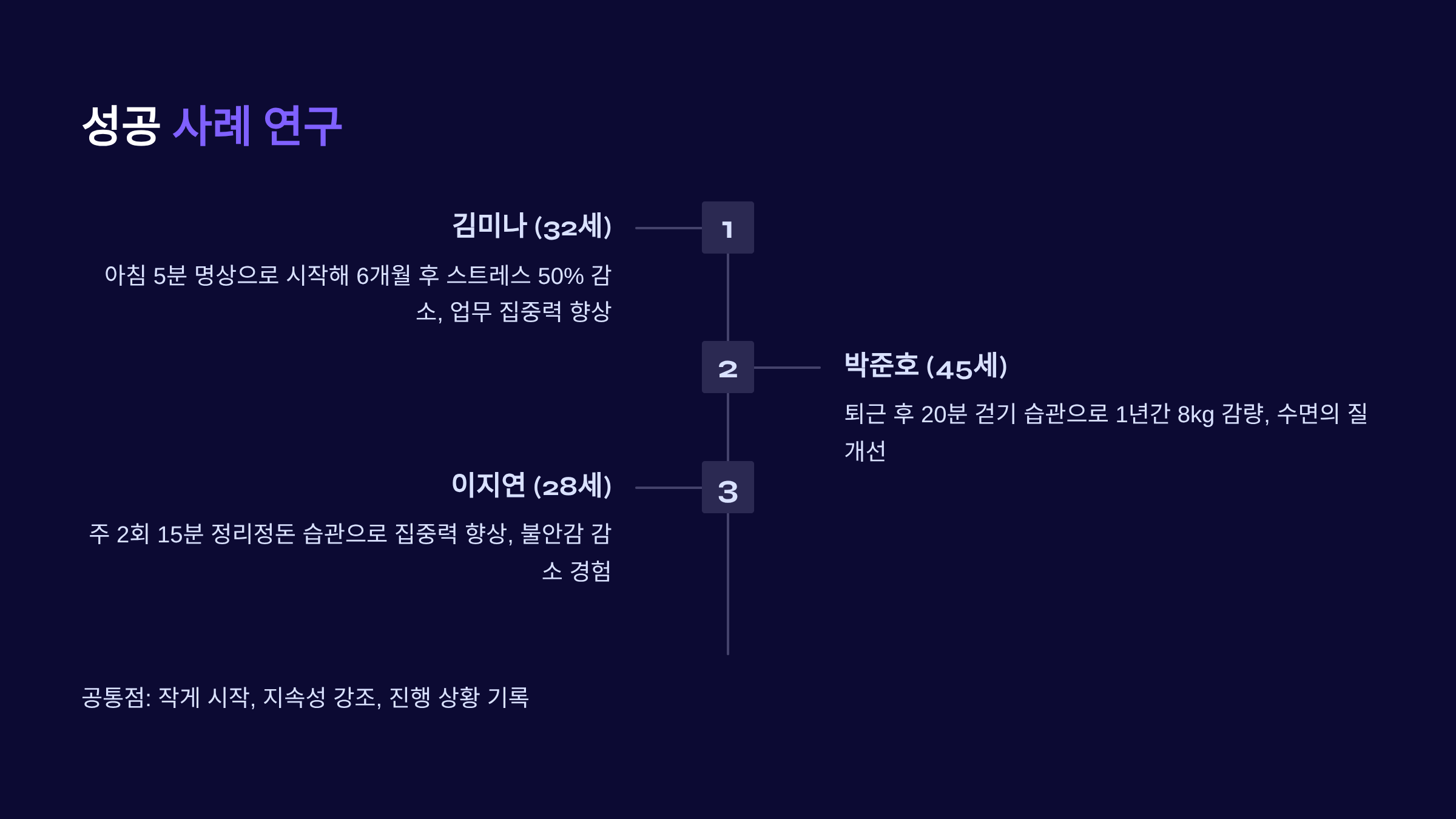 | 인물 | 핵심 습관 | 지속 기간 | 성과 |