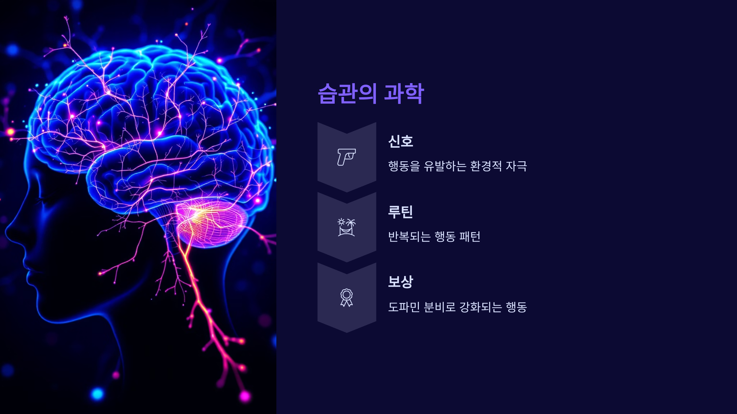 습관 회로는 신호-반복행동-보상의 3단계로 구성되어 있어요. 예를 들어 스마트폰 알림 소리(신호)를 들으면 자동으로 폰을 확인(반복행동)하고 새로운 정보를 얻는 만족감(보상)을 느끼게 되죠. 이 과정이 수백 번 반복되면 의식적인 노력 없이도 자동으로 행동하게 된답니다. 듀크대학교 연구에 의하면 우리 일상 행동의 약 45%가 이런 습관적 행동이라고 해요.