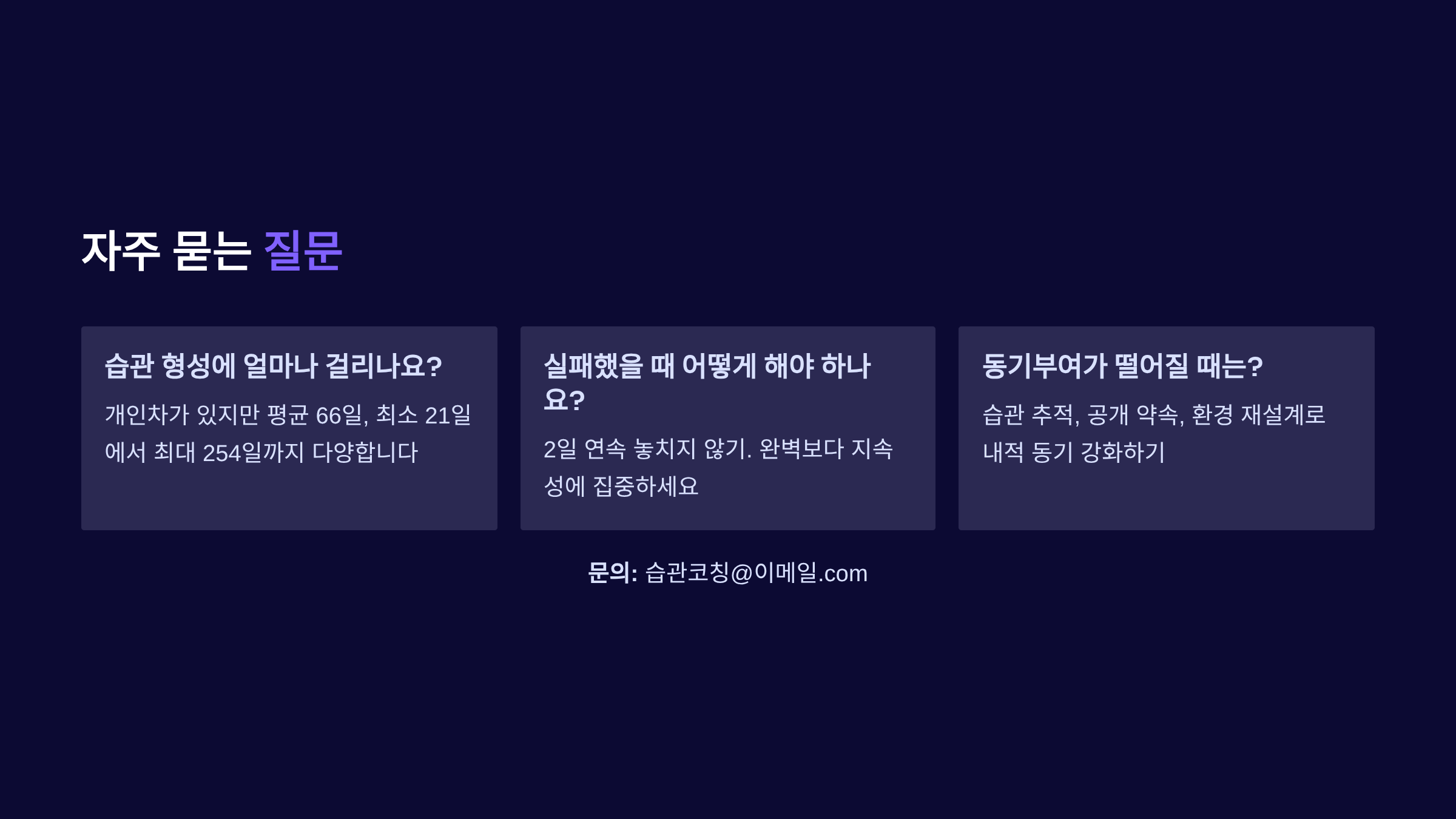 A1. 21일 이론은 1960년대 성형외과 의사 맥스웰 몰츠의 관찰에서 시작됐지만, 과학적 근거는 부족해요. 유니버시티 칼리지 런던의 2009년 연구에 따르면 평균 66일이 걸리고, 개인차와 습관 난이도에 따라 18일에서 254일까지 다양하답니다. 단순한 습관(물 마시기)은 빨리 형성되지만 복잡한 습관(운동)은 더 오래 걸려요.