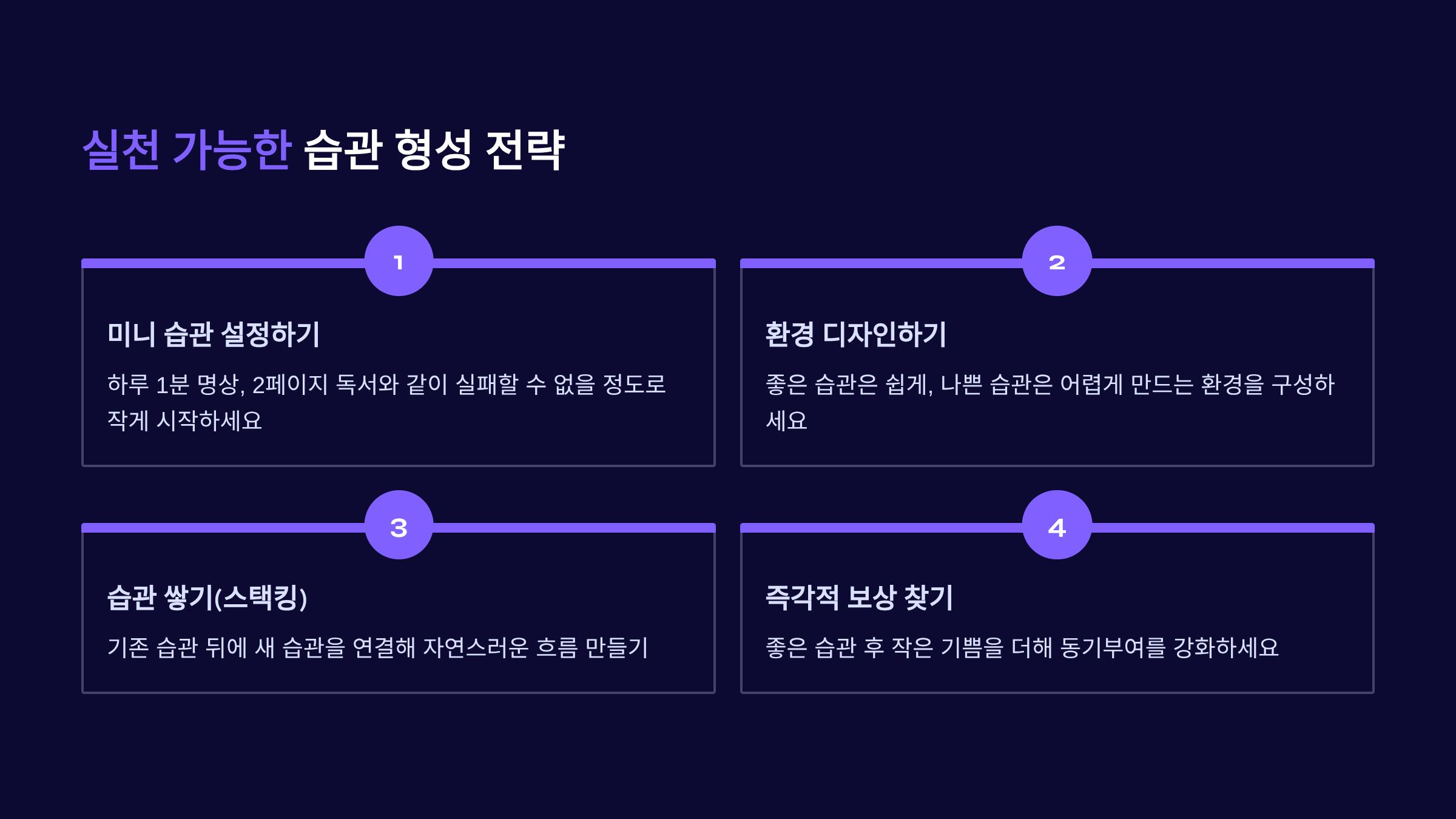실패에 대한 관점도 중요해요. 완벽주의는 습관 형성의 적이에요. 하루 놓쳤다고 포기하지 말고 '2일 연속 놓치지 않기' 규칙을 적용해 보세요. 스탠퍼드 대학의 BJ 포그 교수는 작게 시작하라고 강조해요. 팔 굽혀 펴기 50개가 목표라면 2개부터 시작하세요. 작은 성공이 쌓이면 자연스럽게 늘어난답니다.
