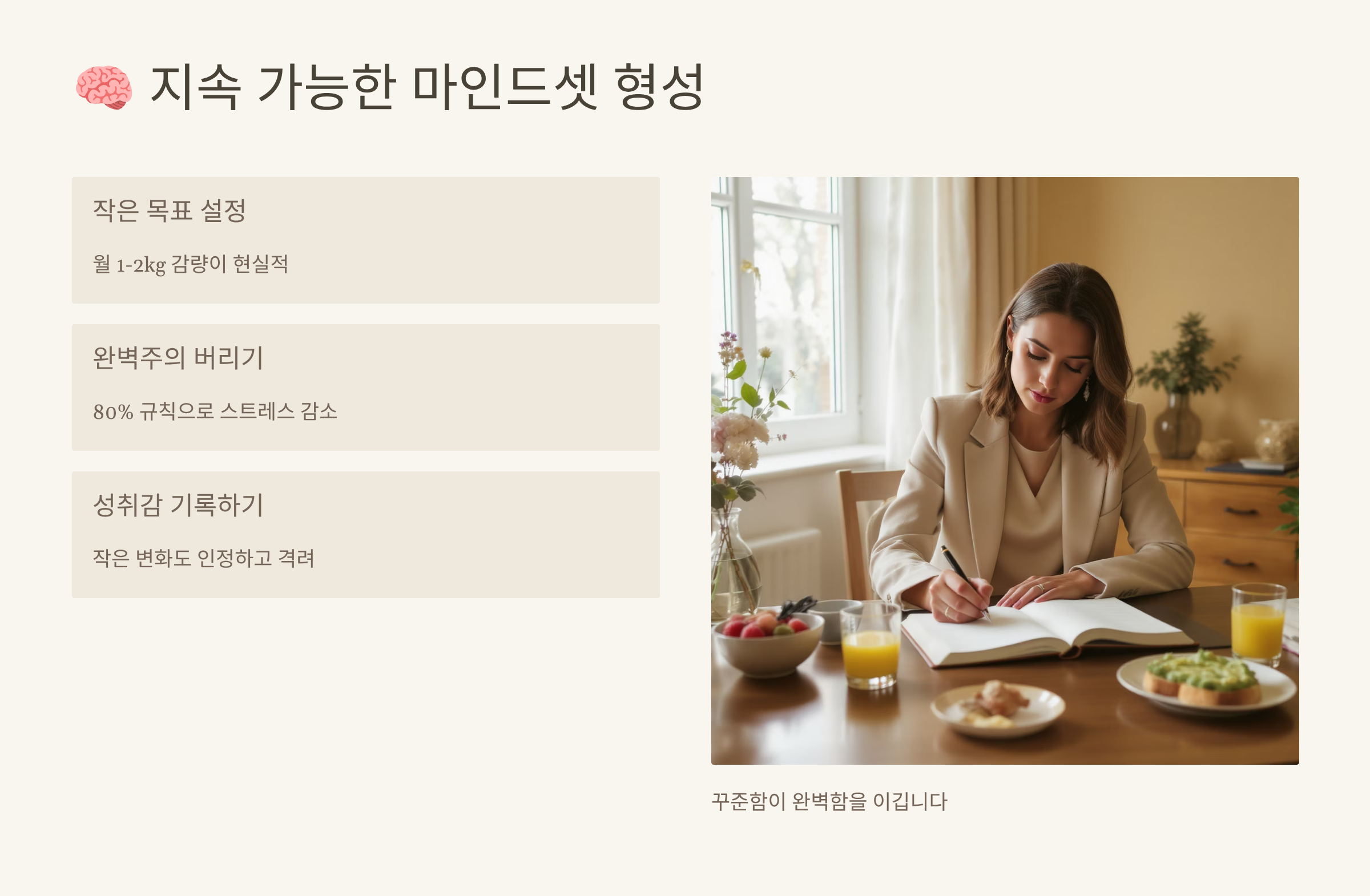 체중 감량의 성공은 마인드셋에서 시작돼요. 단기간의 다이어트가 아니라 평생 건강한 습관을 만든다는 마음가짐이 필요해요. 완벽주의를 버리고 80/20 법칙을 적용해 보세요. 80%만 잘 지켜도 충분한 결과를 얻을 수 있답니다.