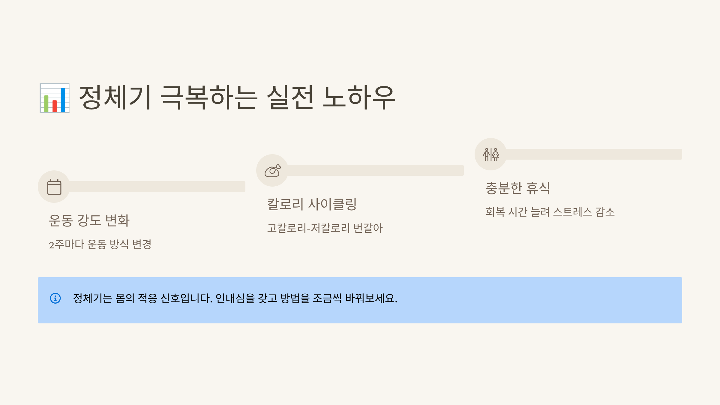 운동 루틴을 바꿔보는 것도 효과적이에요. 같은 운동을 반복하면 몸이 효율적으로 적응해서 칼로리 소모가 줄어들어요. 유산소 위주였다면 근력 운동을 늘리고, 강도나 시간을 조절해 보세요. 새로운 자극이 정체기 돌파의 열쇠가 될 수 있어요.
