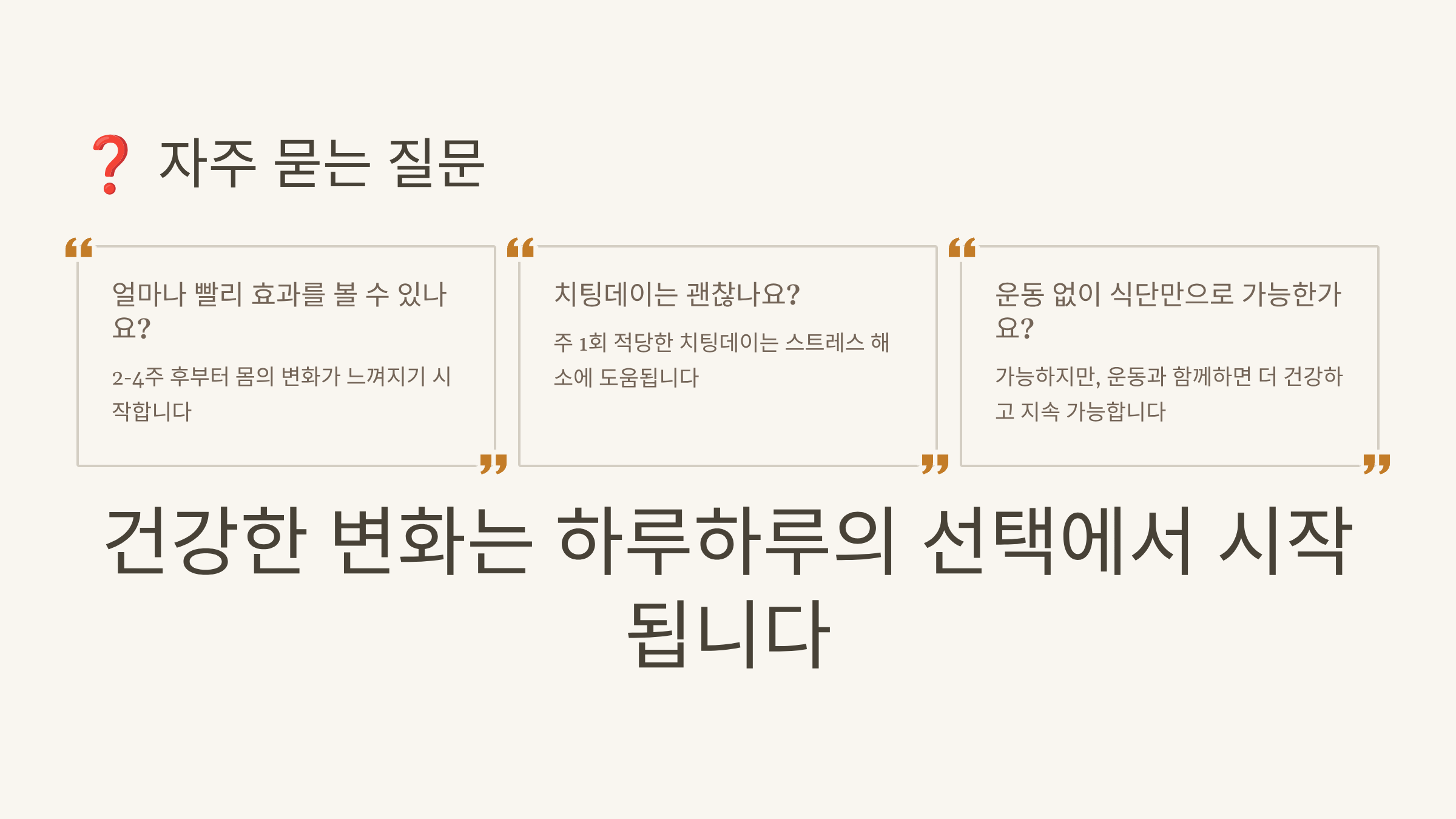 비교하지 마세요. SNS에서 보는 변신 사진들은 극단적인 경우가 많아요. 각자의 몸과 상황이 다르기 때문에 남과 비교하는 것은 의미가 없어요. 어제의 나와 비교하며 조금씩 나아지는 것에 집중하세요. 자신만의 속도로 가는 것이 가장 지속 가능한 방법이랍니다! 🌟