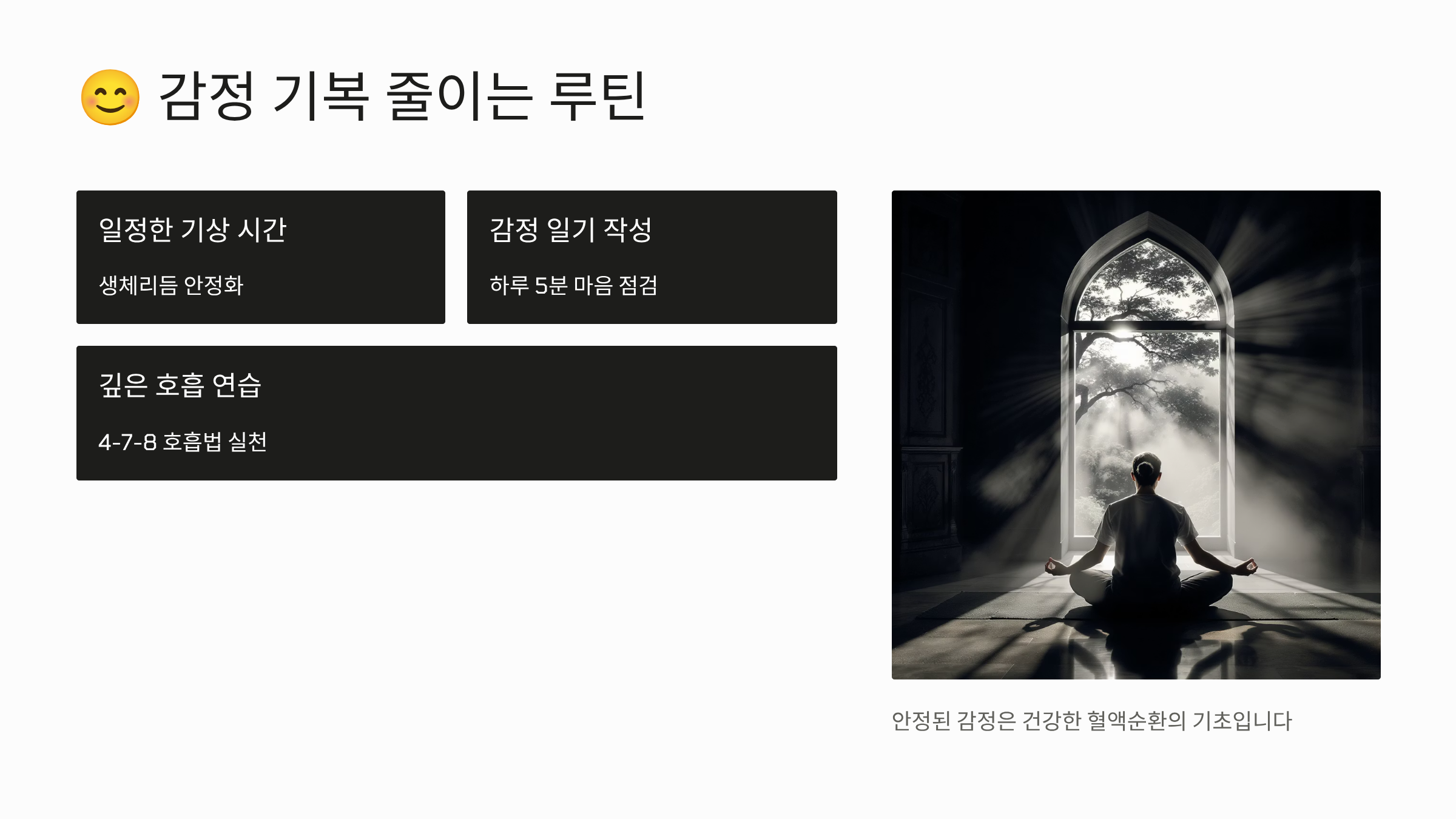 오늘은 혈액순환을 개선하고 동시에 감정의 안정을 찾을 수 있는 실용적인 아침 루틴을 소개해드릴게요. 이 방법들은 의학적 연구와 실제 경험을 바탕으로 정리한 것으로, 꾸준히 실천하면 몸과 마음 모두에 긍정적인 변화를 느끼실 수 있을 거예요.