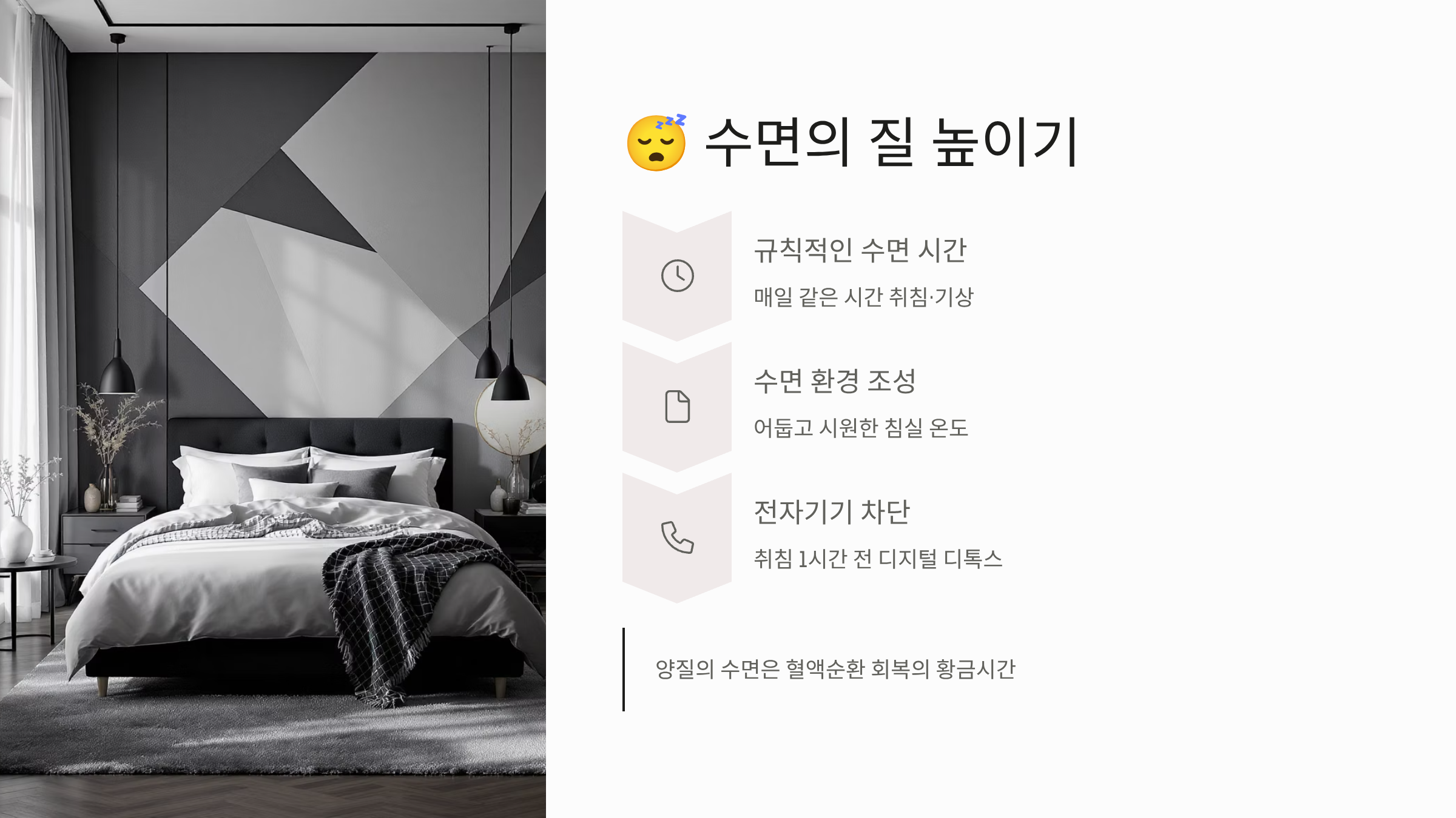 질 좋은 수면은 혈액순환과 감정 안정의 기초가 돼요. 수면 중에는 혈관이 이완되고 혈압이 낮아져 심혈관계가 휴식을 취하게 되죠. 또한 렘수면 동안 감정 처리와 기억 정리가 이루어져 다음 날 감정 조절 능력이 향상돼요. 매일 같은 시간에 잠들고 일어나는 규칙적인 수면 패턴을 만드는 것이 가장 중요해요. 주말에도 평일과 비슷한 시간에 기상하여 생체리듬을 유지해야 한답니다.