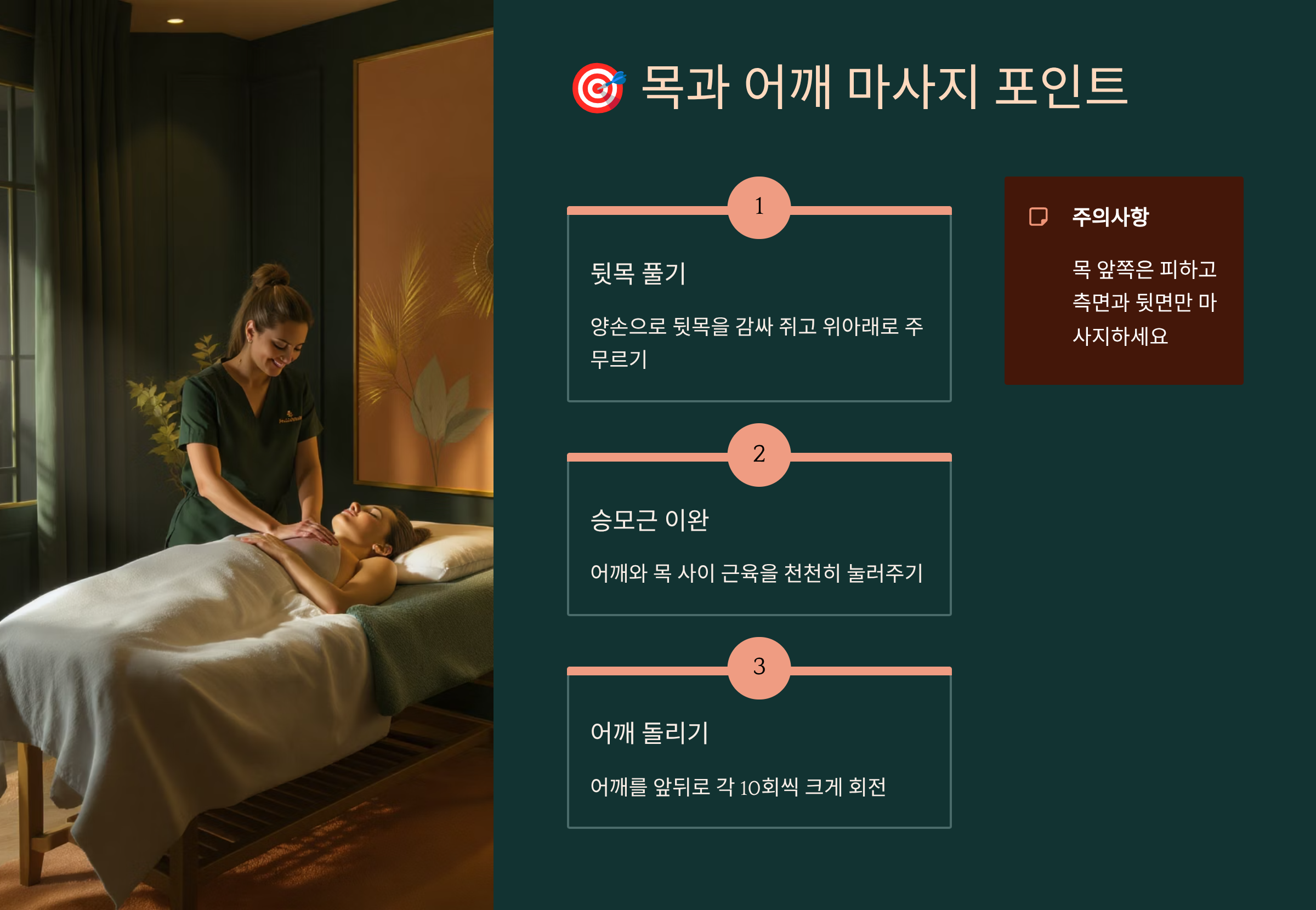 목 마사지를 시작할 때는 먼저 목을 좌우로 천천히 돌려 근육을 이완시켜 주세요. 그다음 손가락으로 목 뒤쪽의 경추 양옆을 위아래로 부드럽게 문질러주세요. 목덜미 부분의 풍지혈과 천주혈은 두통과 어지럼증 완화에 효과적인 지압점이에요. 엄지손가락으로 3초간 눌렀다 떼는 동작을 5회 반복하면 좋아요.