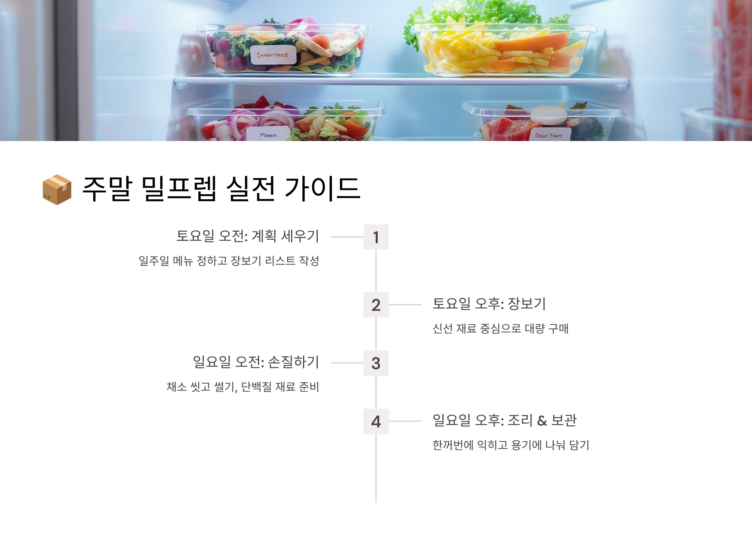 밀프렙(Meal Prep)은 주말에 일주일 치 식사를 미리 준비하는 방법이에요. 미국에서 시작된 이 트렌드가 한국에서도 큰 인기를 끌고 있답니다. 매일 요리할 시간이 없는 직장인, 학생들에게 정말 유용한 방법이죠. 일요일 2~3시간 투자로 평일 내내 건강한 식사를 할 수 있어요!