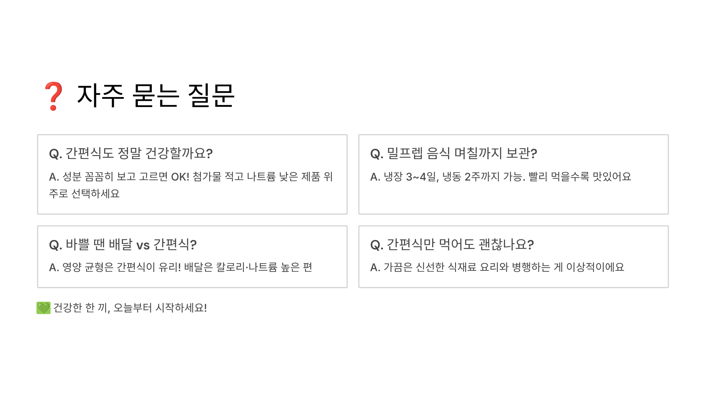 A6. 평균적으로 외식 대비 30~50% 저렴해요. 외식 평균 비용이 1만 원이라면 간편식은 5,000~7,000원 선이죠. 배달음식과 비교하면 배달료와 팁을 고려했을 때 더욱 경제적입니다.