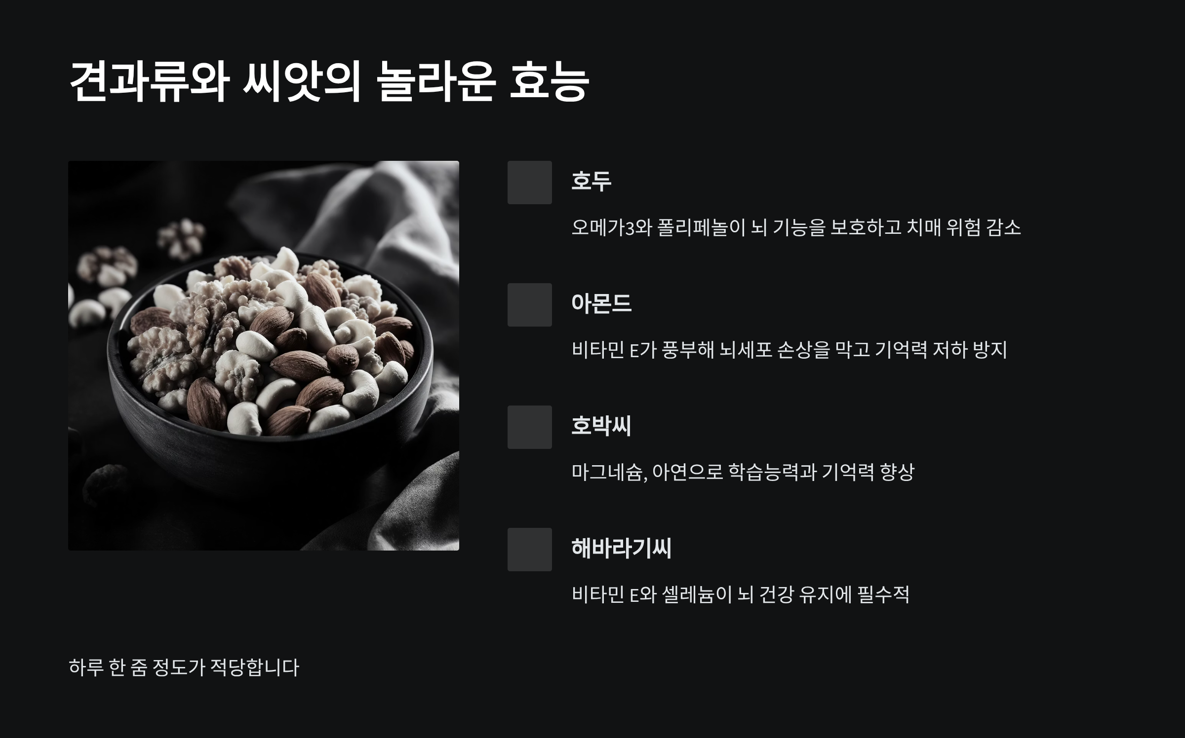 | 견과류 | 주요 영양소 | 하루 권장량 |