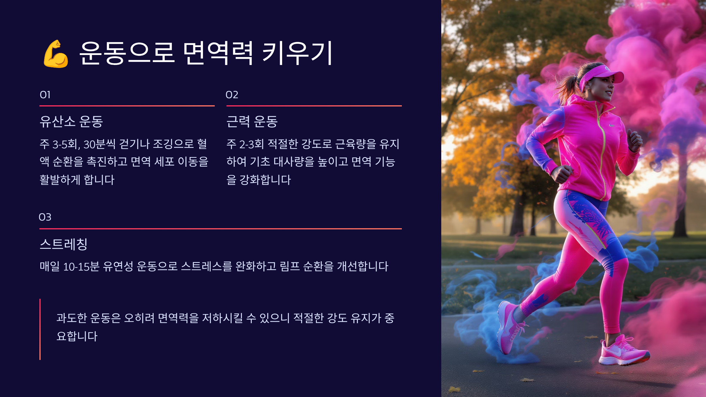 운동 강도 조절이 핵심이에요. 과도한 운동은 오히려 면역력을 떨어뜨릴 수 있어요. 운동 후 극심한 피로감이 느껴지거나 다음 날까지 근육통이 심하다면 강도를 낮춰야 해요. 주 3-5회, 한 번에 30-60분 정도가 적당해요. 운동 전후 스트레칭은 필수고요. 충분한 수분 섭취와 단백질 보충도 잊지 마세요. 운동과 휴식의 균형이 건강한 면역체계를 만든답니다.