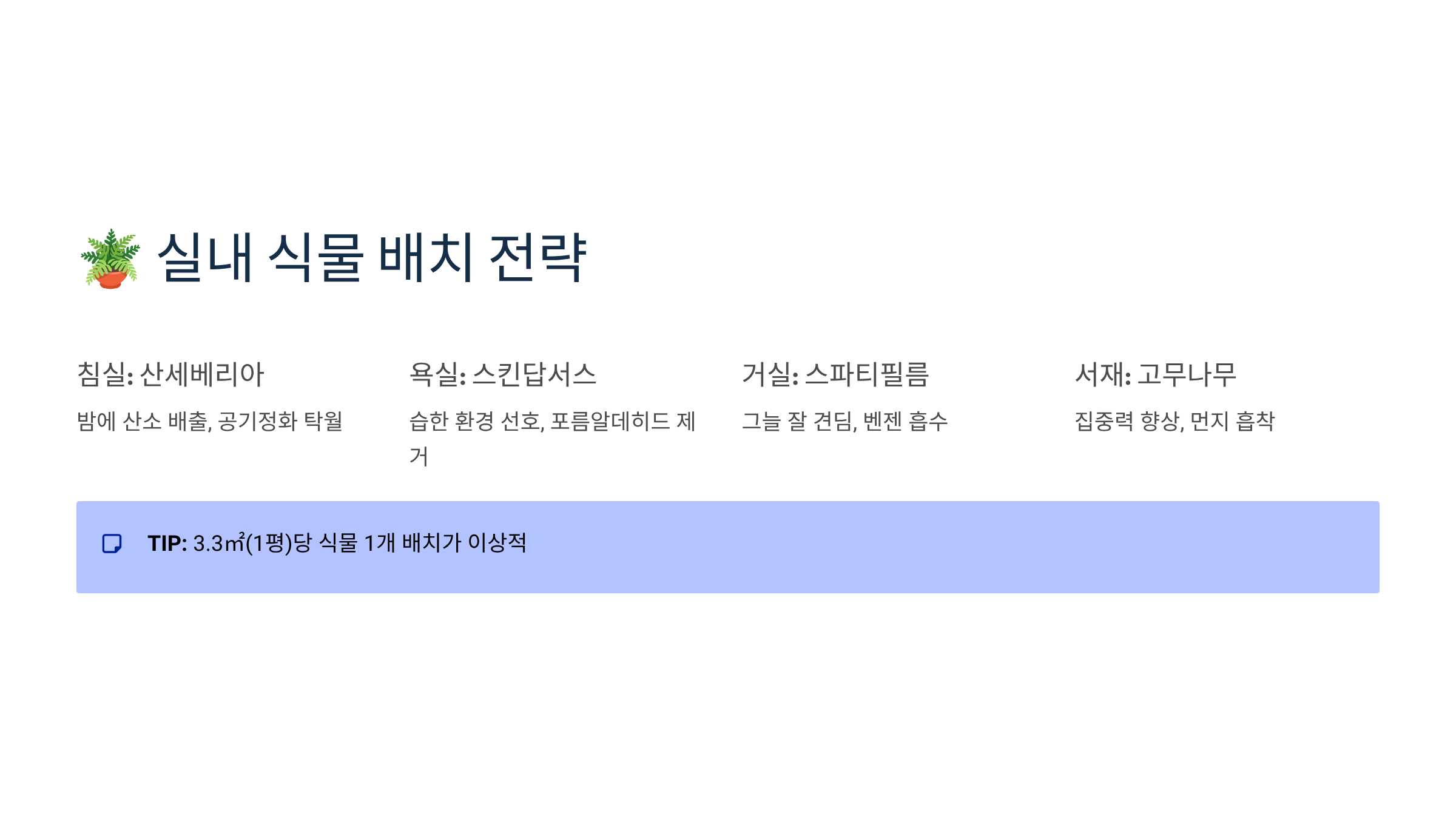 거실에는 아레카야자나 고무나무처럼 큰 식물을 배치하면 좋아요. 이들은 공기 정화 능력이 뛰어나고 존재감도 있어 인테리어 포인트가 된답니다. 침실에는 산세베리아나 스투키 같은 식물이 적합해요. 이들은 밤에도 산소를 배출해 수면의 질을 높여주거든요. 다만 향이 강한 식물은 피하는 게 좋아요.