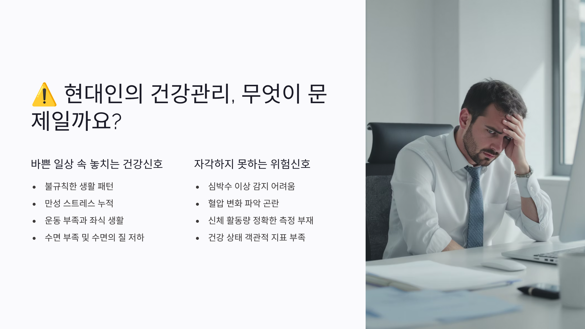 현대인의 70% 이상이 만성피로에 시달리고 있다는 사실, 알고 계셨나요? 장시간 앉아서 일하는 직장인들은 하루 평균 9시간 이상을 의자에서 보내고 있어요. 이런 생활 패턴이 계속되면 심혈관 질환 위험이 무려 147% 증가한다고 해요. 게다가 스트레스로 인한 불규칙한 심박수는 우리가 모르는 사이에 건강을 위협하고 있답니다.