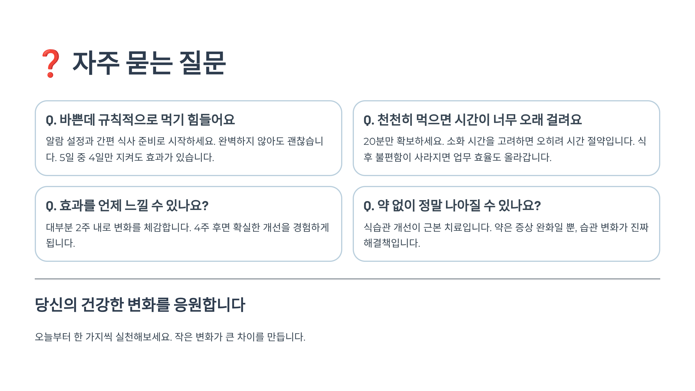 A6. 스트레스 관리와 식습관 개선을 병행하세요. 식전 심호흡 3회, 식사 중 스마트폰 금지, 감사 일기 쓰기 등이 도움 돼요. 요가나 명상도 좋고, 규칙적인 운동으로 스트레스를 해소하면 소화기능도 함께 개선된답니다.
