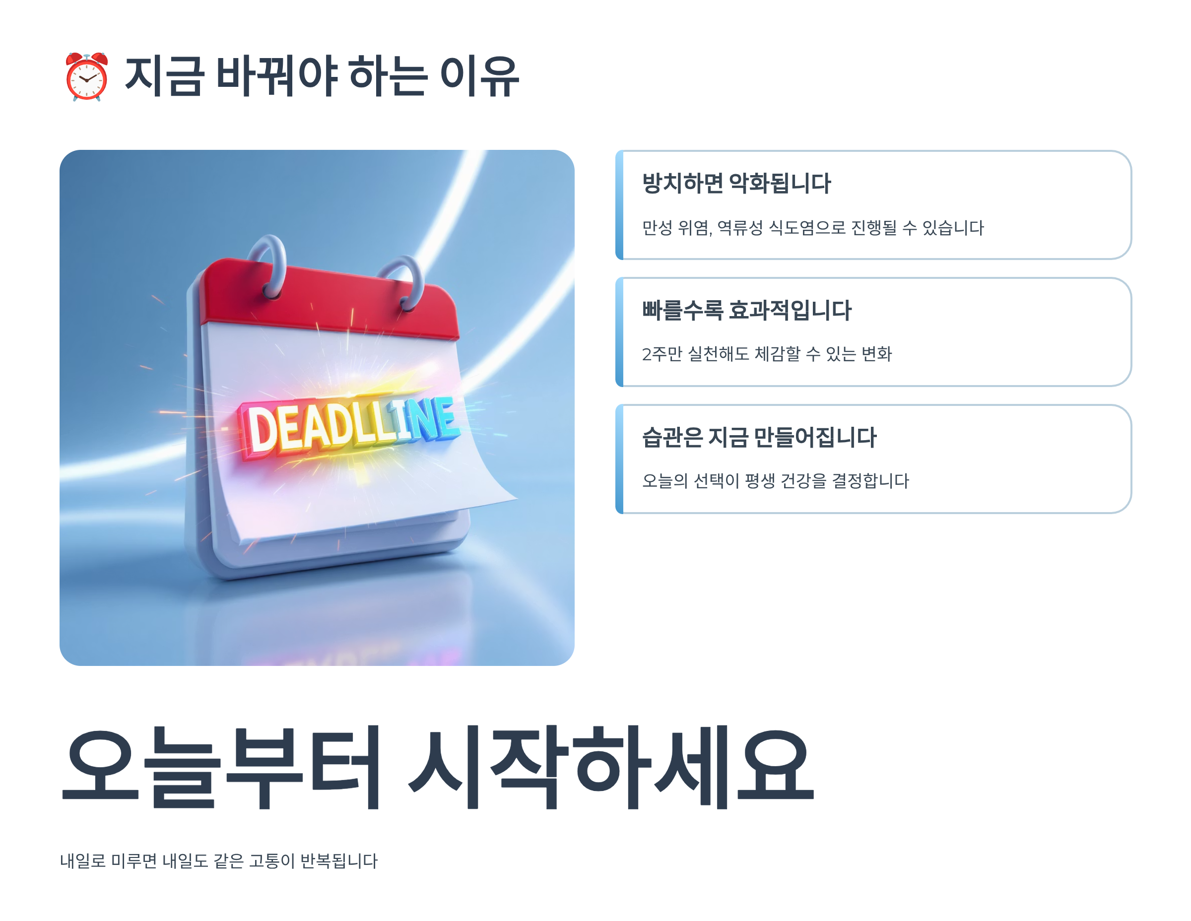 혹시 "나중에 해야지" 하고 미루고 계신가요? 안 돼요! 지금 당장 시작해야 하는 절박한 이유들이 있어요. 소화기 건강은 한 번 망가지면 회복하는 데 몇 배의 시간과 노력이 필요하거든요. 더 늦기 전에 시작하세요! 🚨