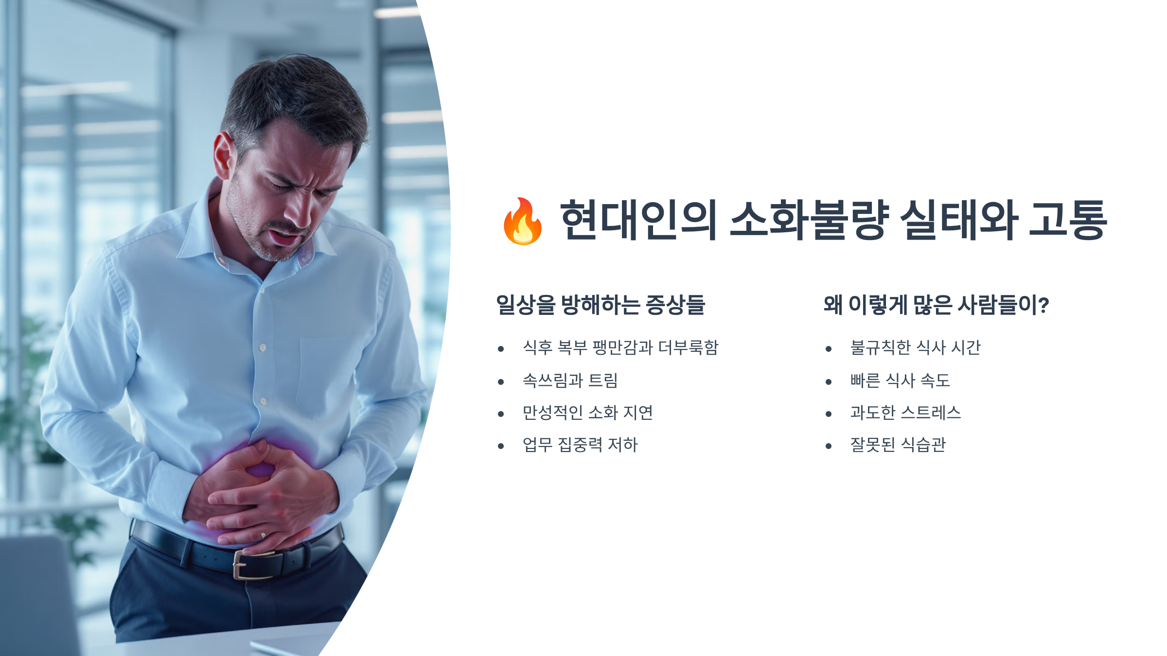 한국인 10명 중 7명이 소화불량을 경험한다는 사실, 알고 계셨나요? 특히 직장인들의 경우 불규칙한 식사시간과 스트레스로 인해 더 심각한 상황이에요. 급하게 먹는 점심, 늦은 저녁 회식, 야식까지... 우리의 위장은 매일 전쟁터나 다름없답니다.