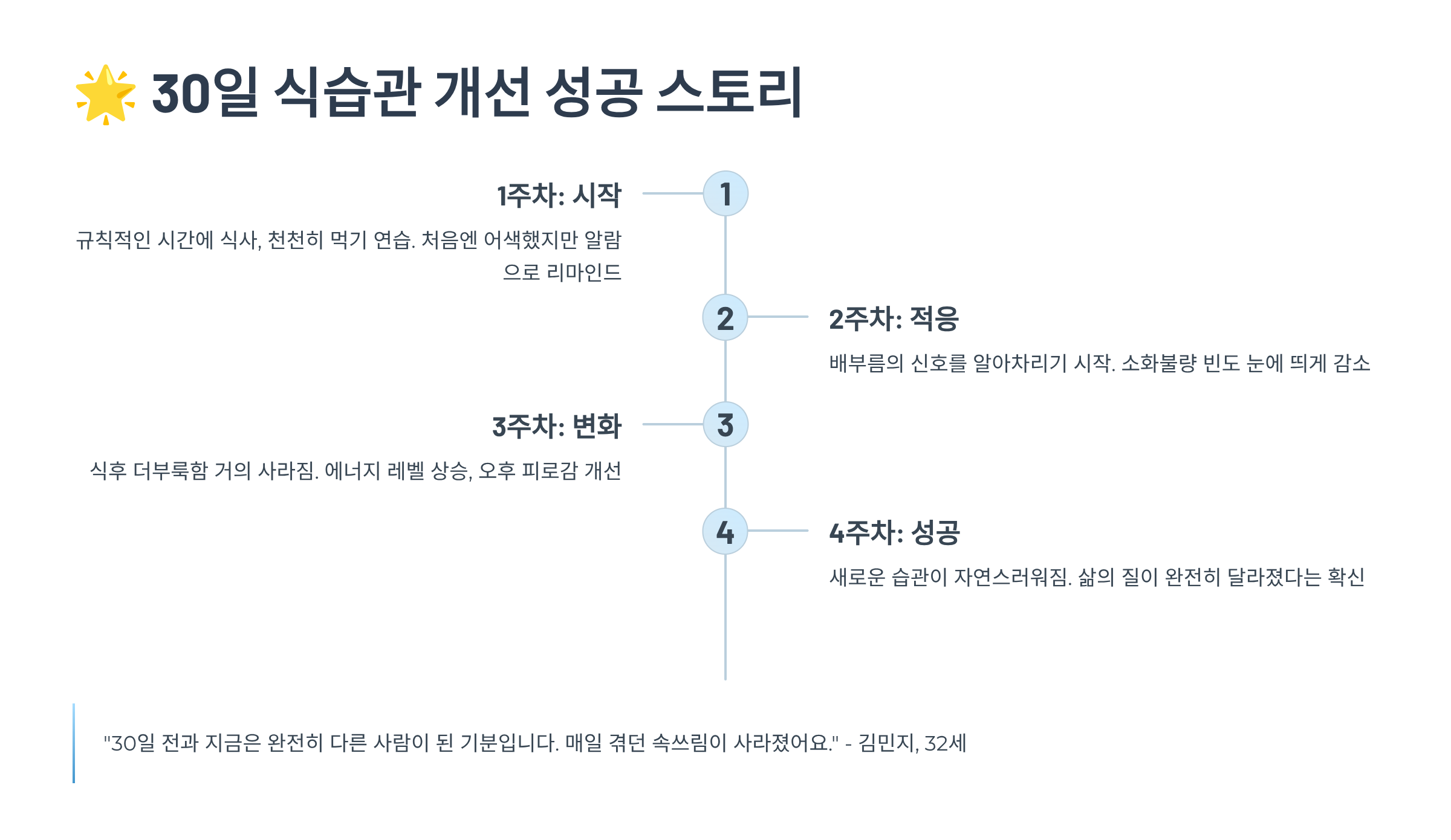 두 번째는 28세 IT 개발자 최 씨의 이야기예요. 야근과 스트레스로 역류성 식도염 진단을 받았는데, 식사 시간을 규칙적으로 바꾸고 천천히 먹기를 실천한 지 2개월 만에 증상이 90% 개선되었어요. 체중도 5kg 감량하는 보너스까지 얻으셨답니다!