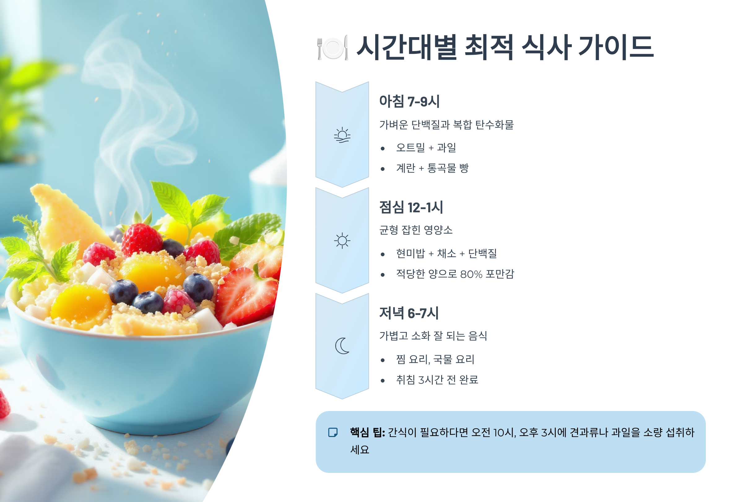 저녁 6-7시 (저녁 식사): 점심보다 30% 적게 드세요. 찜이나 구이 요리가 튀김보다 소화가 잘돼요. 매운 음식이나 기름진 음식은 피하고, 담백한 두부 요리나 닭가슴살이 좋아요. 식후 바로 눕지 말고 최소 2시간은 앉아 있거나 가볍게 움직이세요.