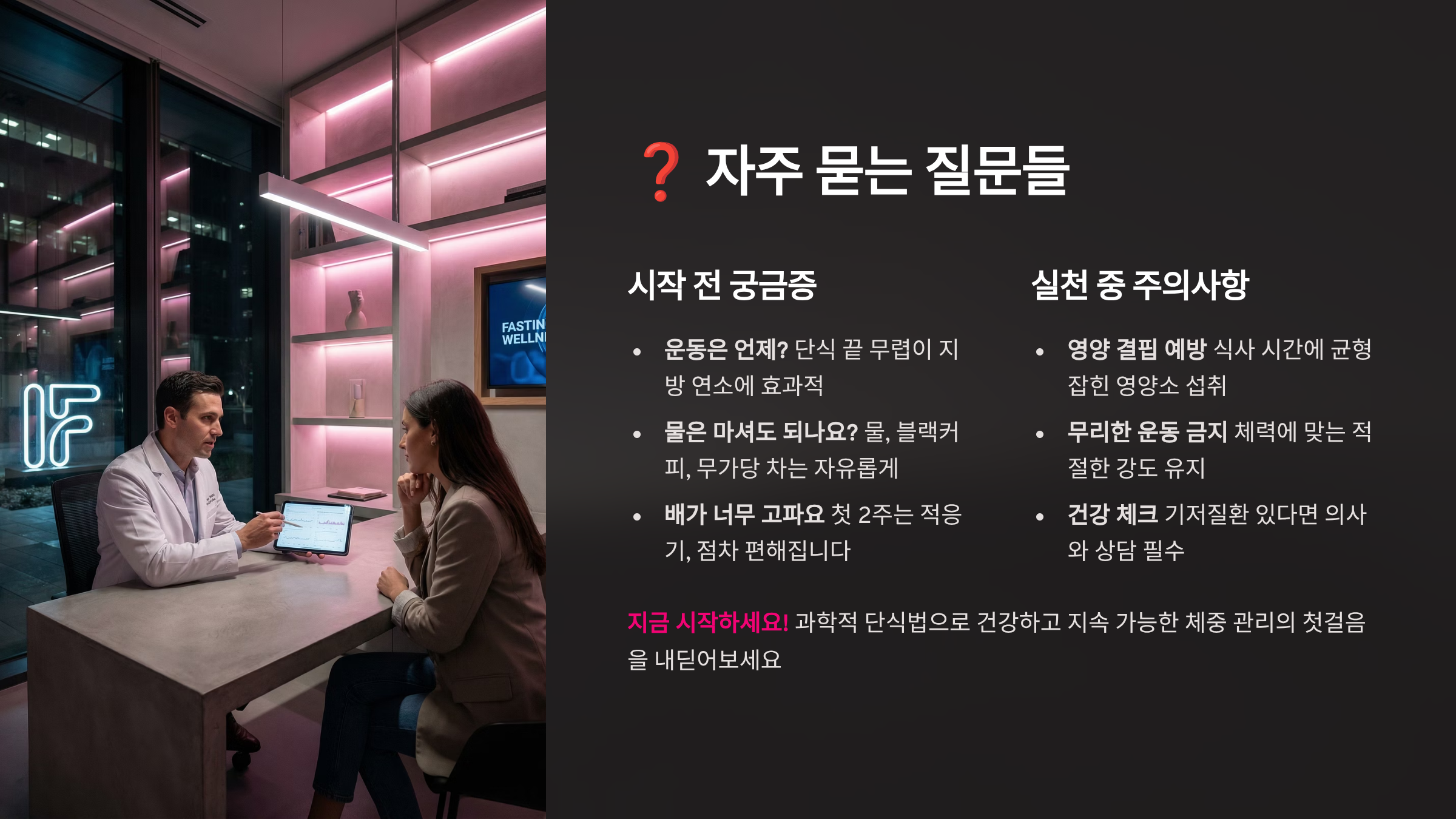 A8. 공복 유산소는 단식 막바지에, 근력운동은 식사 후 2-3시간 뒤가 효과적이에요. 개인차가 있으니 본인에게 맞는 타이밍을 찾으세요.