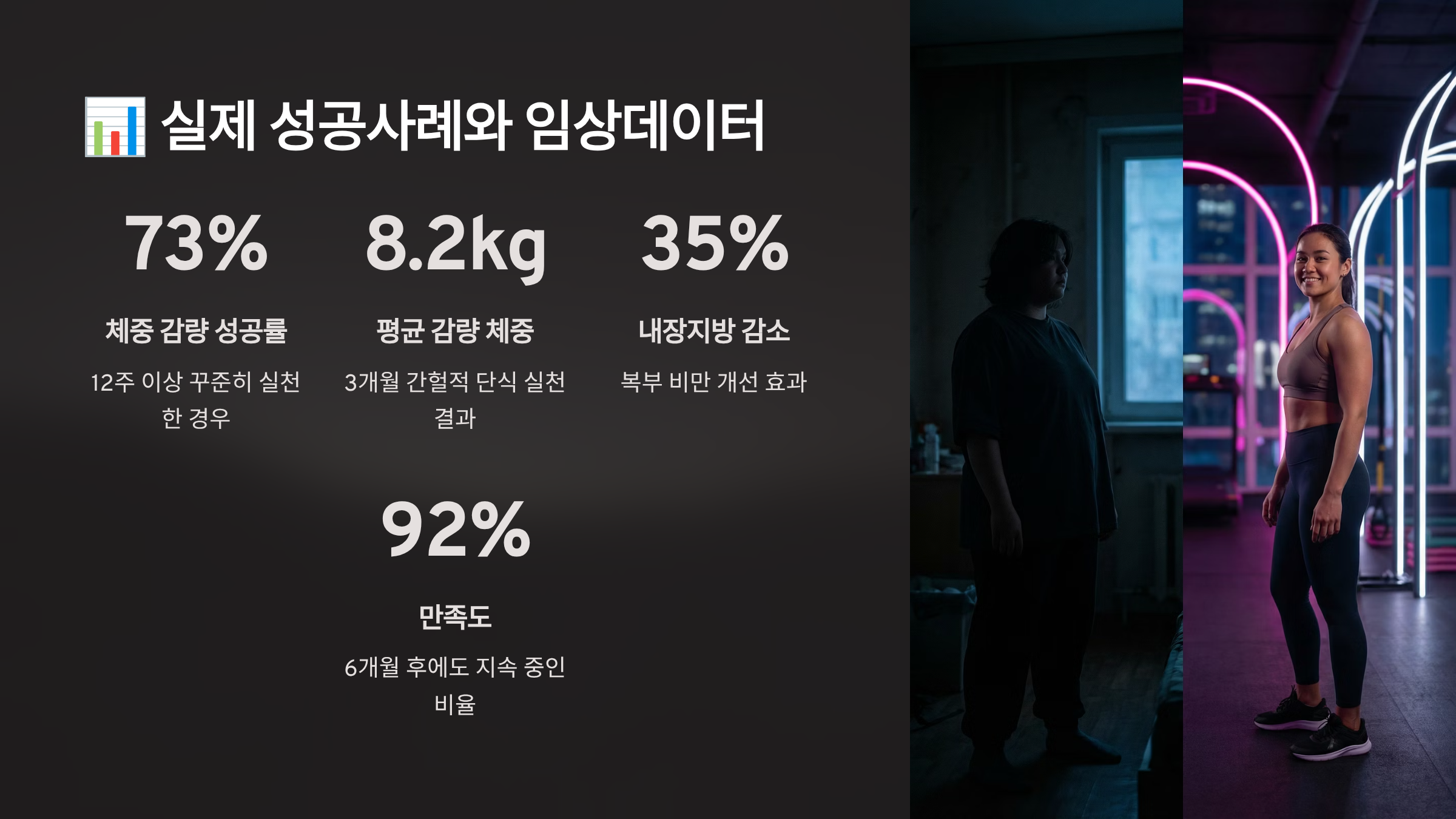 이론만으로는 부족하죠? 실제 성공사례들을 보면 더 확실해질 거예요! 🎯 서울대병원 가정의학과에서 2024년 발표한 연구 결과가 정말 흥미로워요. 300명의 한국인을 대상으로 6개월간 진행한 임상시험에서, 16:8 그룹은 평균 체중 8.2kg 감소, 체지방률 5.3% 감소를 보였고, 5:2 그룹은 평균 체중 6.8kg 감소, 체지방률 4.1% 감소를 기록했답니다.