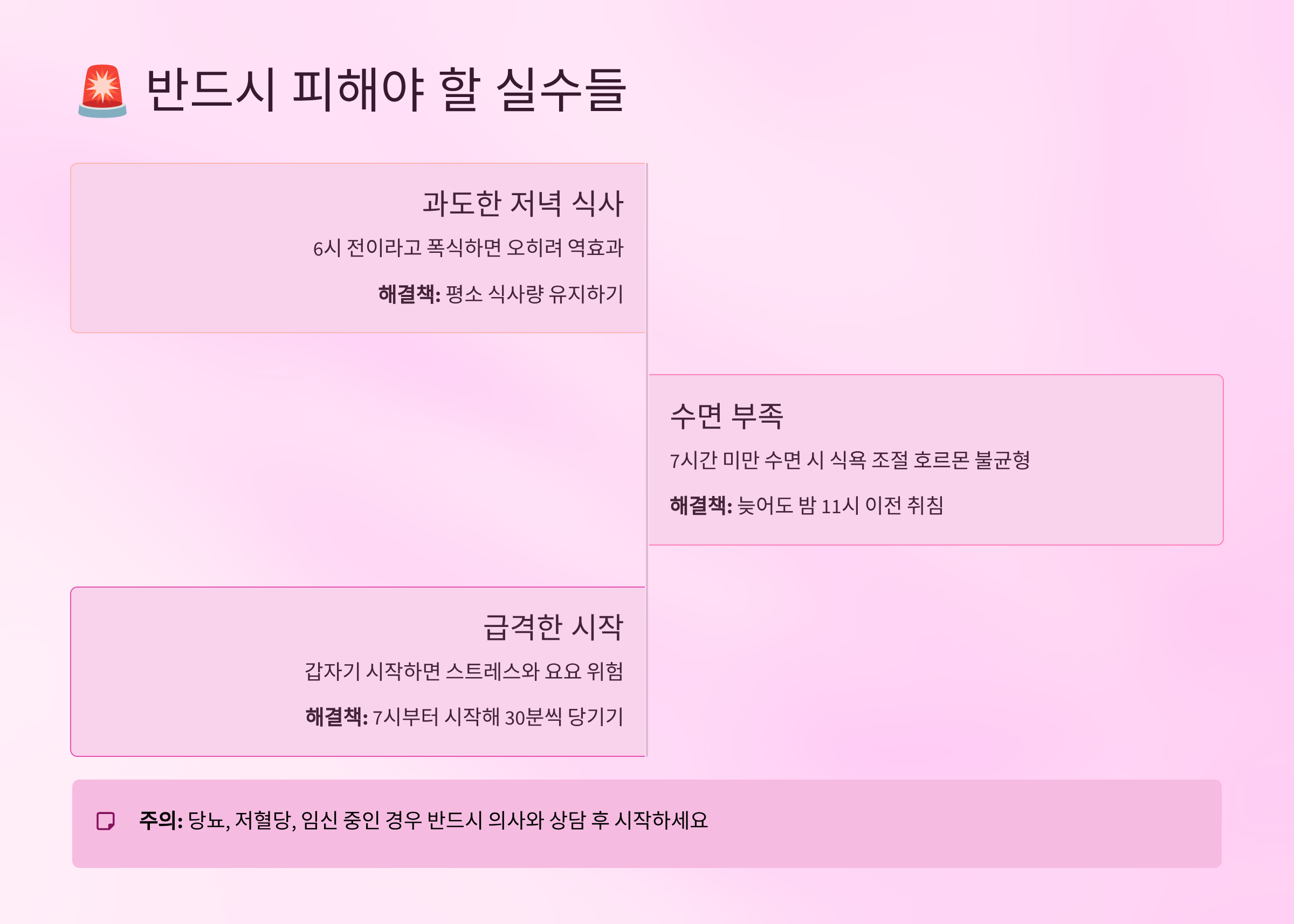 마지막으로 '의학적 상담 무시'는 정말 위험해요. 기저 질환이 있거나 약을 복용 중이라면 반드시 의사와 상담하세요. 특히 당뇨약, 혈압약, 갑상선약을 복용 중이라면 더욱 주의가 필요해요. 저녁 금식이 약물 대사에 영향을 줄 수 있거든요. 건강이 최우선이라는 것을 잊지 마세요! 🏥