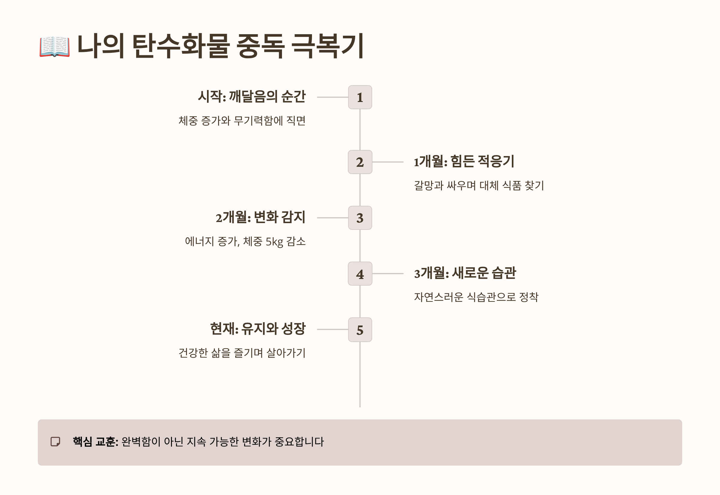 마지막으로 음식과의 관계가 건강해져요. 더 이상 음식에 지배당하지 않고, 진정한 배고픔과 포만감을 느낄 수 있게 되죠. 음식을 즐기되 의존하지 않는 자유로운 상태가 되는 거예요. 이게 바로 제가 생각하는 탄수화물 중독 탈출의 가장 큰 선물이에요! 💝