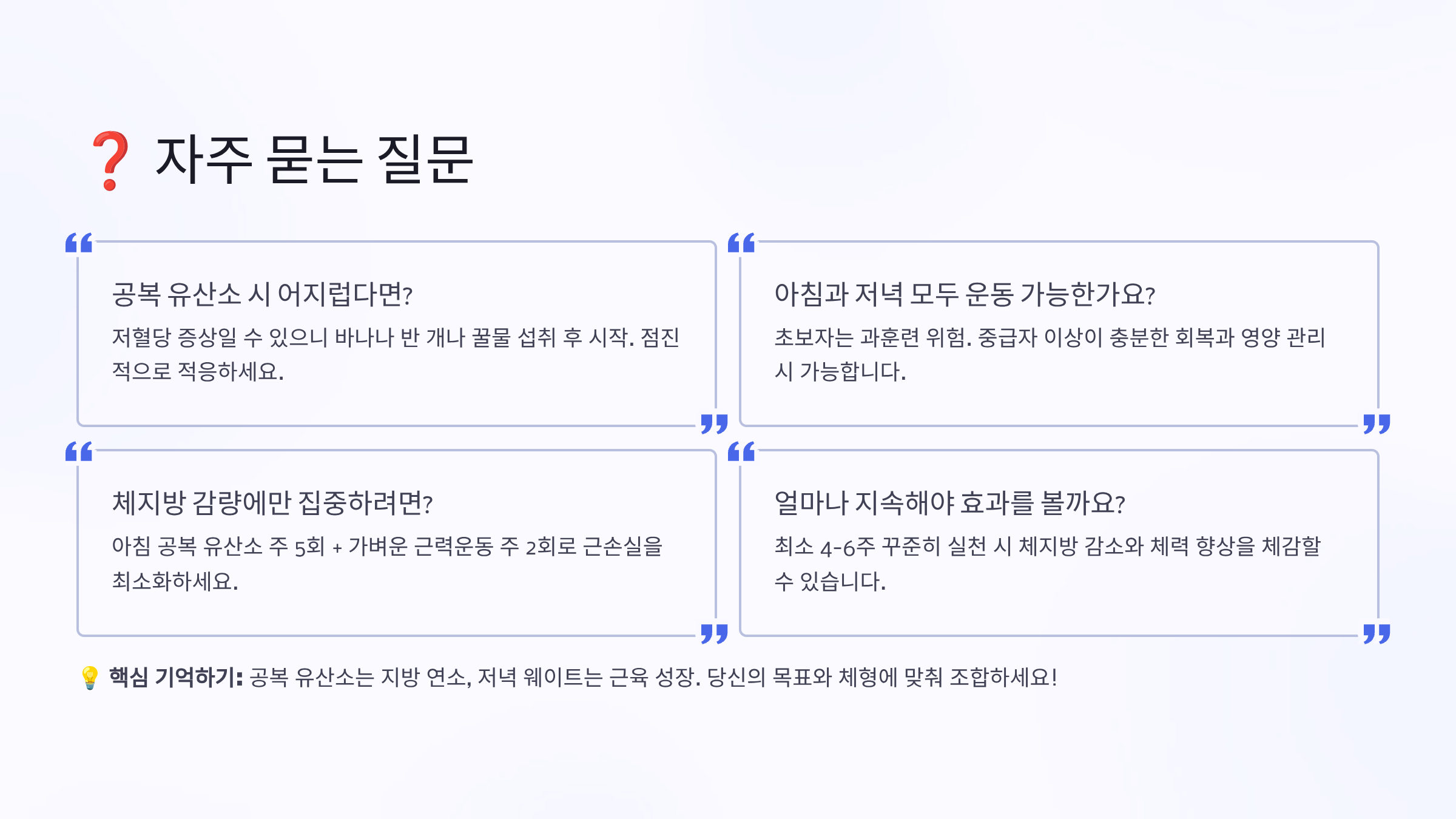 | 타이밍 | 공복 유산소 | 저녁 웨이트 | 주의사항 |