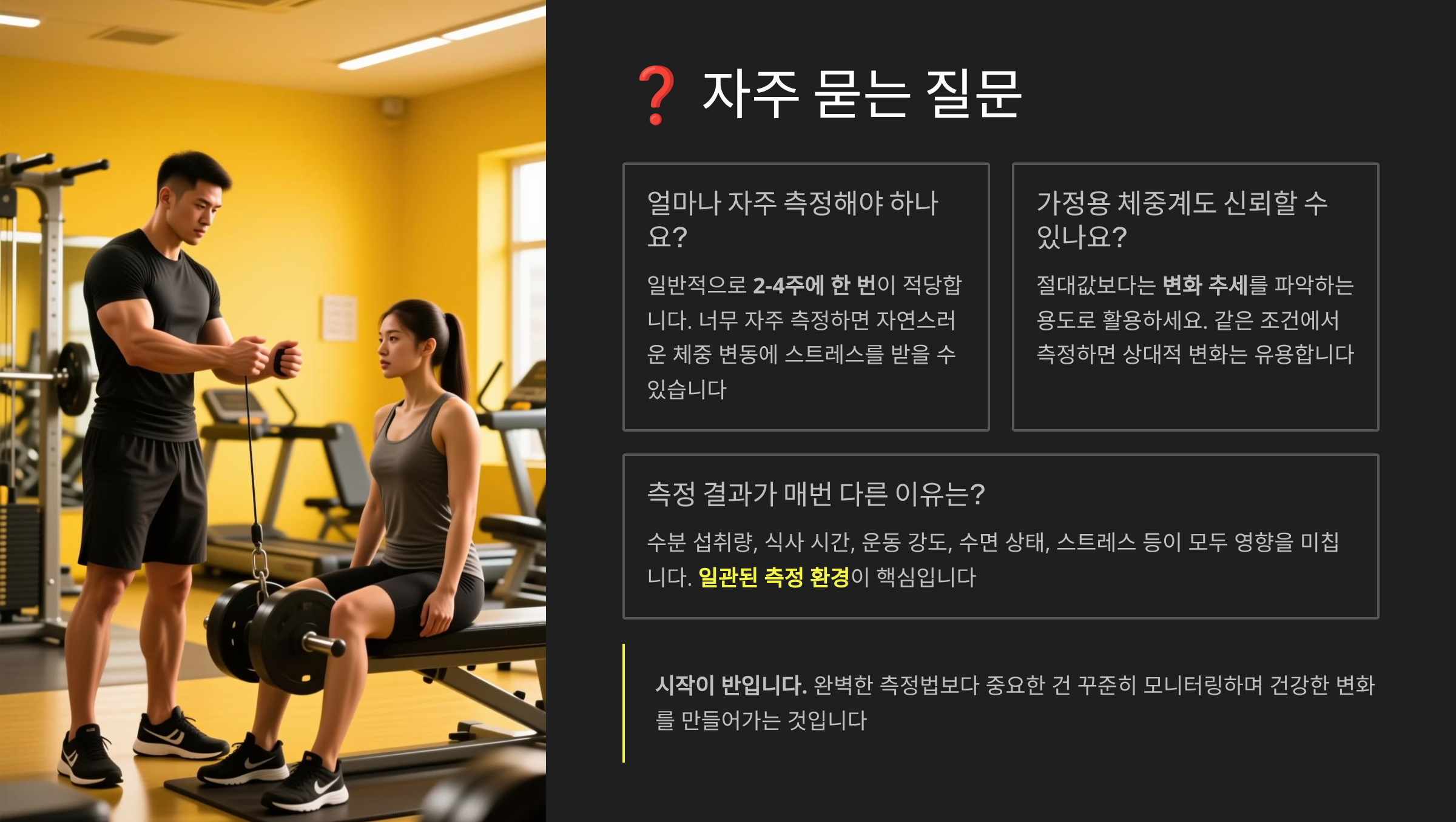 마지막으로 심리적 요인도 무시할 수 없어요. 측정값에 너무 집착하면 오히려 스트레스로 인해 코르티솔이 증가해요. 이는 수분 저류를 일으켜 체지방률을 높게 만들어요. 측정은 도구일 뿐이에요. 거울에 비친 모습, 옷 핏, 체력 변화도 함께 고려하세요. 숫자에 매몰되지 말고 전체적인 건강 개선에 집중하세요! 💪