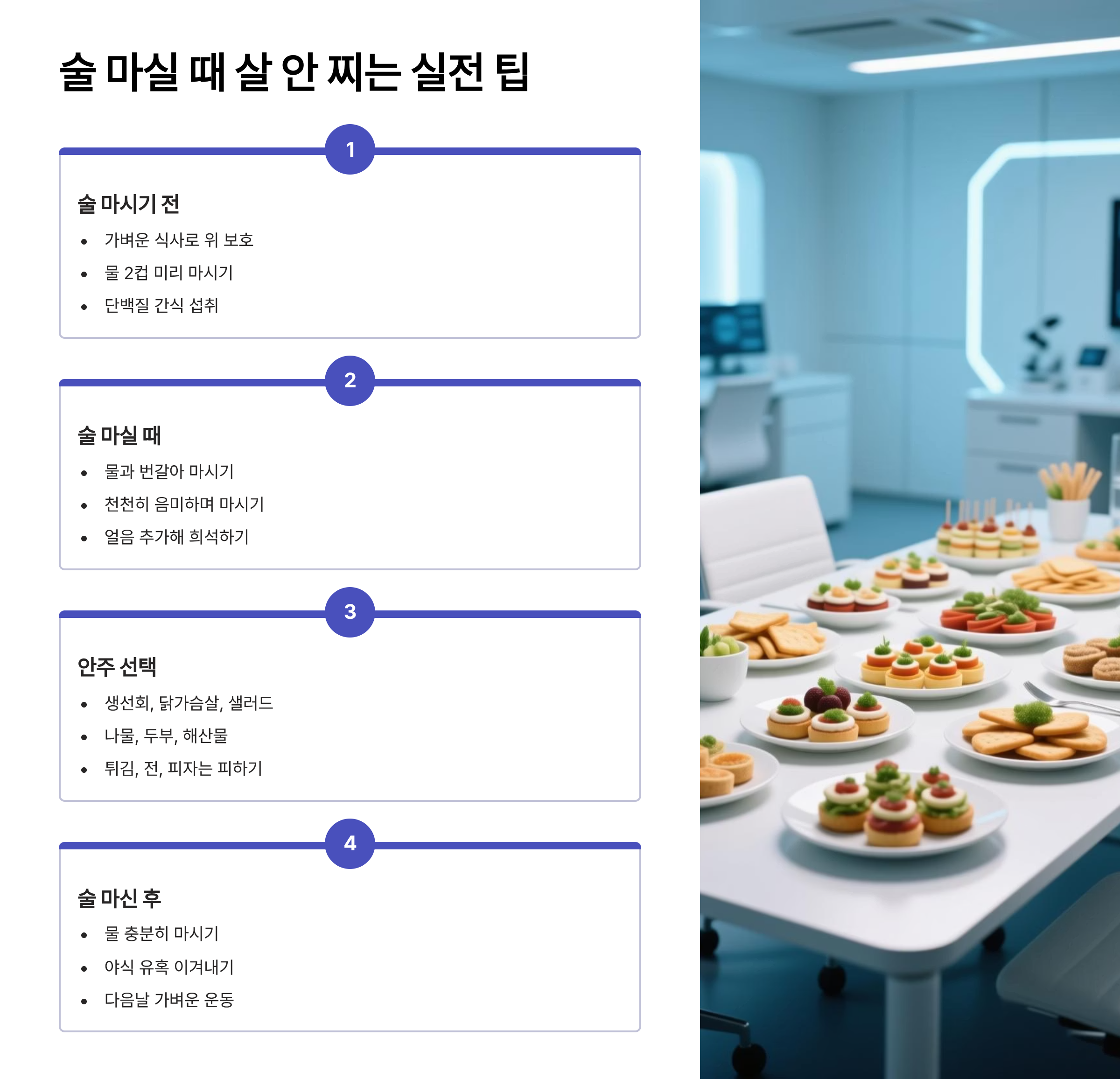술을 마시기로 했다면 최대한 살이 안 찌는 방법으로 마셔야겠죠? 몇 가지 실전 팁만 알아도 같은 술을 마셔도 다이어트에 미치는 영향을 크게 줄일 수 있어요. 지금부터 실제로 효과 있는 방법들을 알려드릴게요.