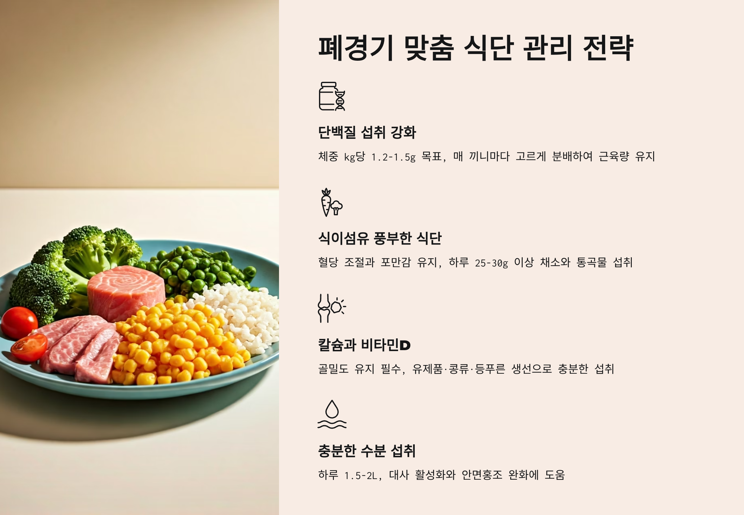 폐경기 체중 관리에서 식단은 가장 중요한 요소 중 하나예요. 하지만 무조건 적게 먹는 것이 답은 아니에요. 오히려 영양소가 부족하면 근육 손실이 가속화되고, 기초대사량이 더 떨어져서 역효과가 날 수 있어요. 핵심은 덜 먹는 것이 아니라 똑똑하게 먹는 것이에요. 🍽️