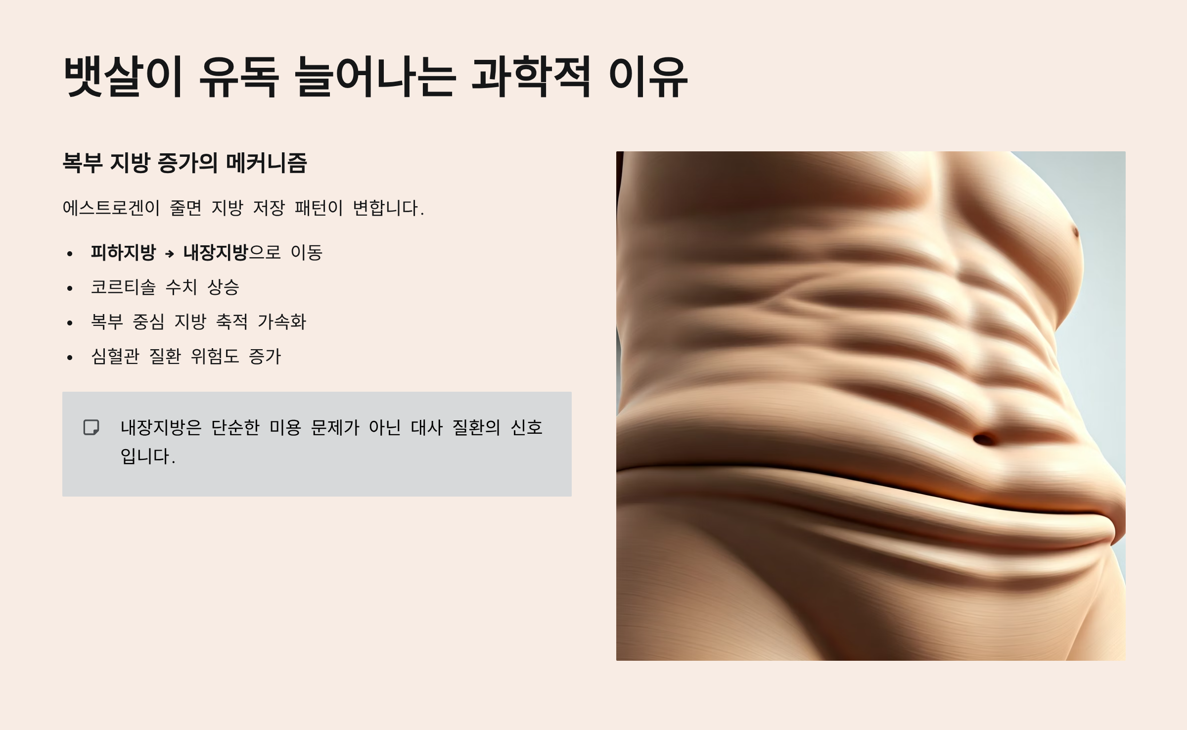 | 에스트로겐 | 급격한 감소 | 복부 지방 축적 증가 |