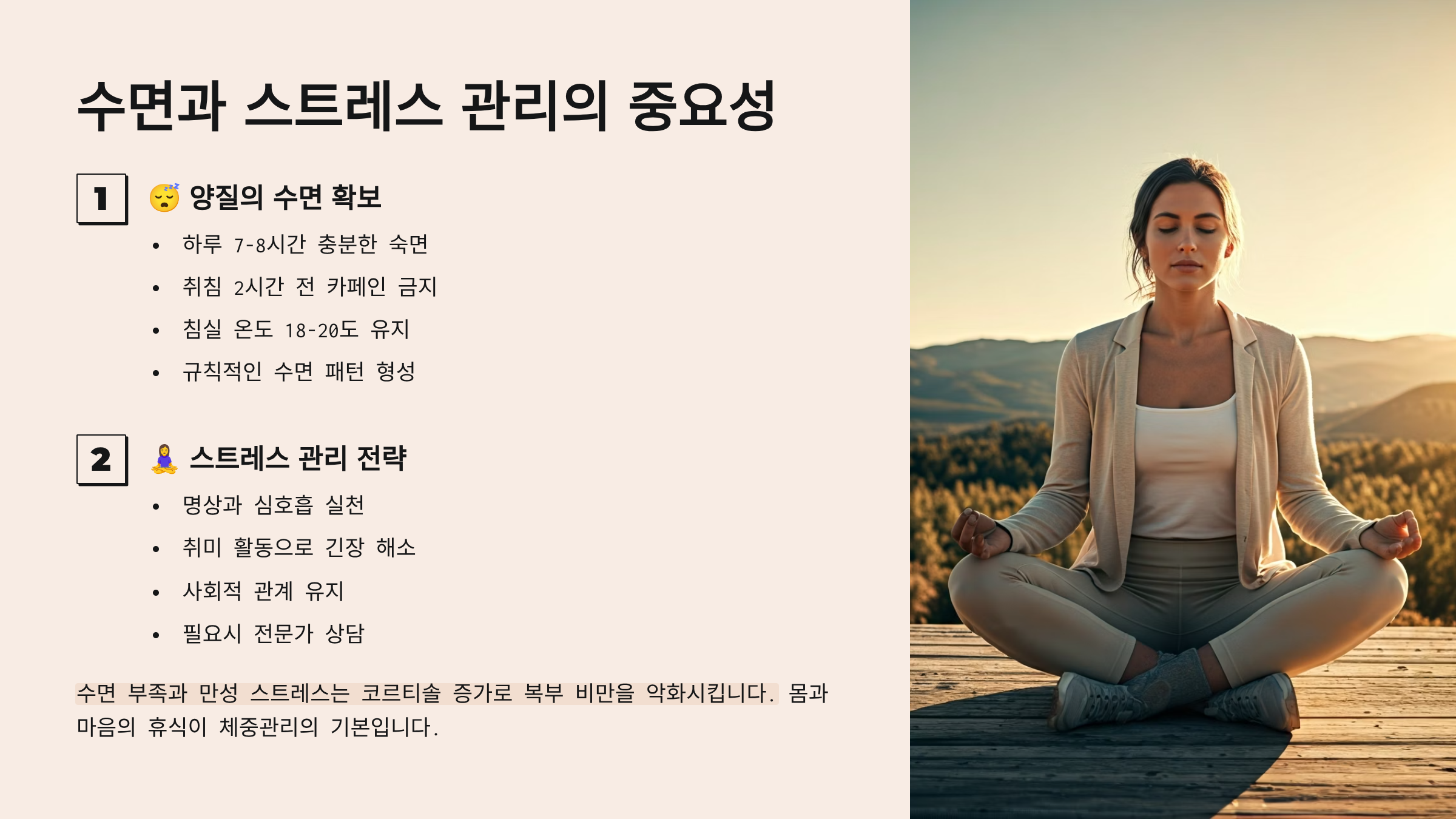 스트레스 관리도 체중 조절에 직접적인 영향을 미쳐요. 만성적인 스트레스는 코르티솔 호르몬을 지속적으로 높이고, 이는 복부 지방 축적, 식욕 증가, 인슐린 저항성 증가로 이어져요. 폐경기에는 호르몬 변화로 인해 감정 기복이 심해지고 스트레스에 더 취약해지기 쉬워요. 😰