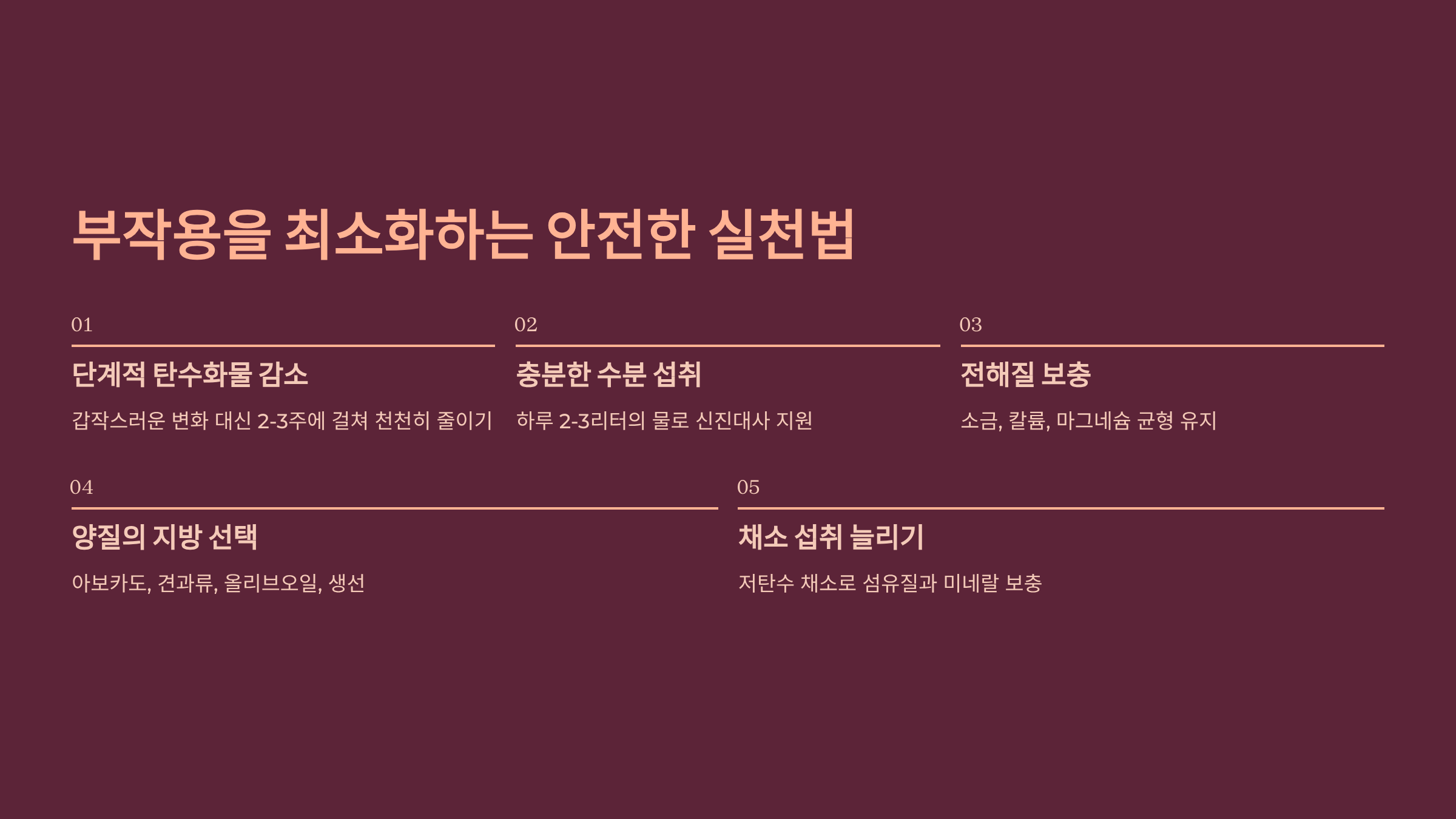 케토 플루, 변비, 탈모, 생리 불순 등 다양한 부작용이 발생할 수 있으므로, 몸의 신호에 귀 기울이고 이상 증상이 지속되면 즉시 다이어트를 재고해야 해요. 점진적인 접근, 충분한 수분과 전해질 보충, 건강한 지방 선택이 부작용을 줄이는 핵심이랍니다.