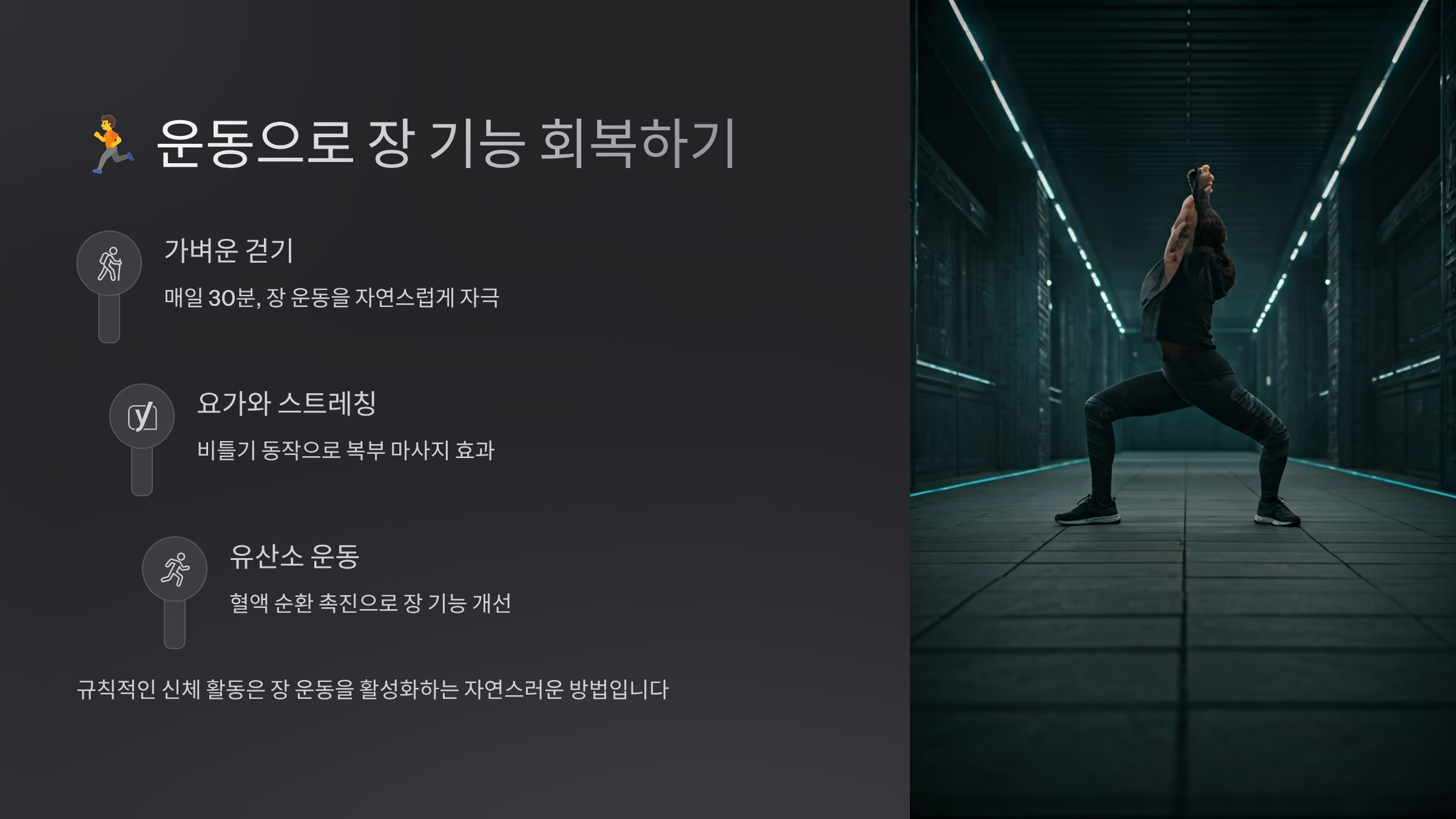 유산소 운동이 장 운동 활성화에 효과적이에요. 빠르게 걷기, 조깅, 자전거 타기 같은 운동은 장의 연동 운동을 촉진해요. 하루 30분 이상, 주 5회 정도의 유산소 운동이 이상적이에요. 운동 강도는 약간 숨이 차지만 대화가 가능한 정도가 적당해요.