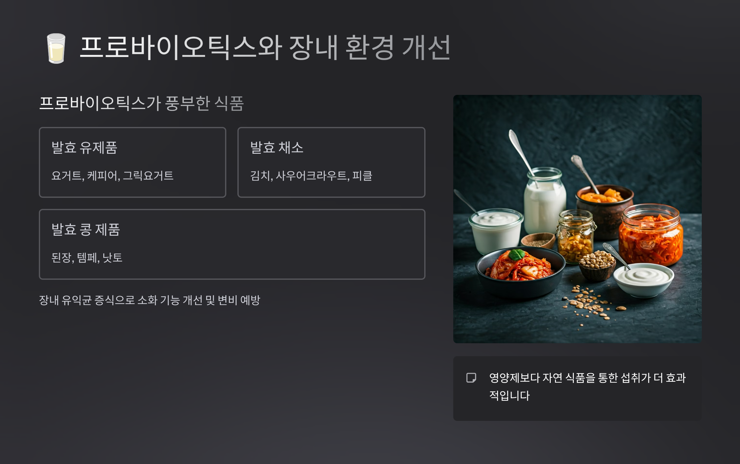 프로바이오틱스가 풍부한 발효 식품을 섭취하는 것이 가장 자연스러운 방법이에요. 요구르트, 케피어, 김치, 사우어크라우트, 미소, 템페 등이 대표적이죠. 특히 무가당 그릭 요구르트는 단백질도 풍부해서 다이어트에도 좋아요. 하루 1-2회 정도 발효 식품을 섭취하면 장 건강이 눈에 띄게 좋아진답니다.