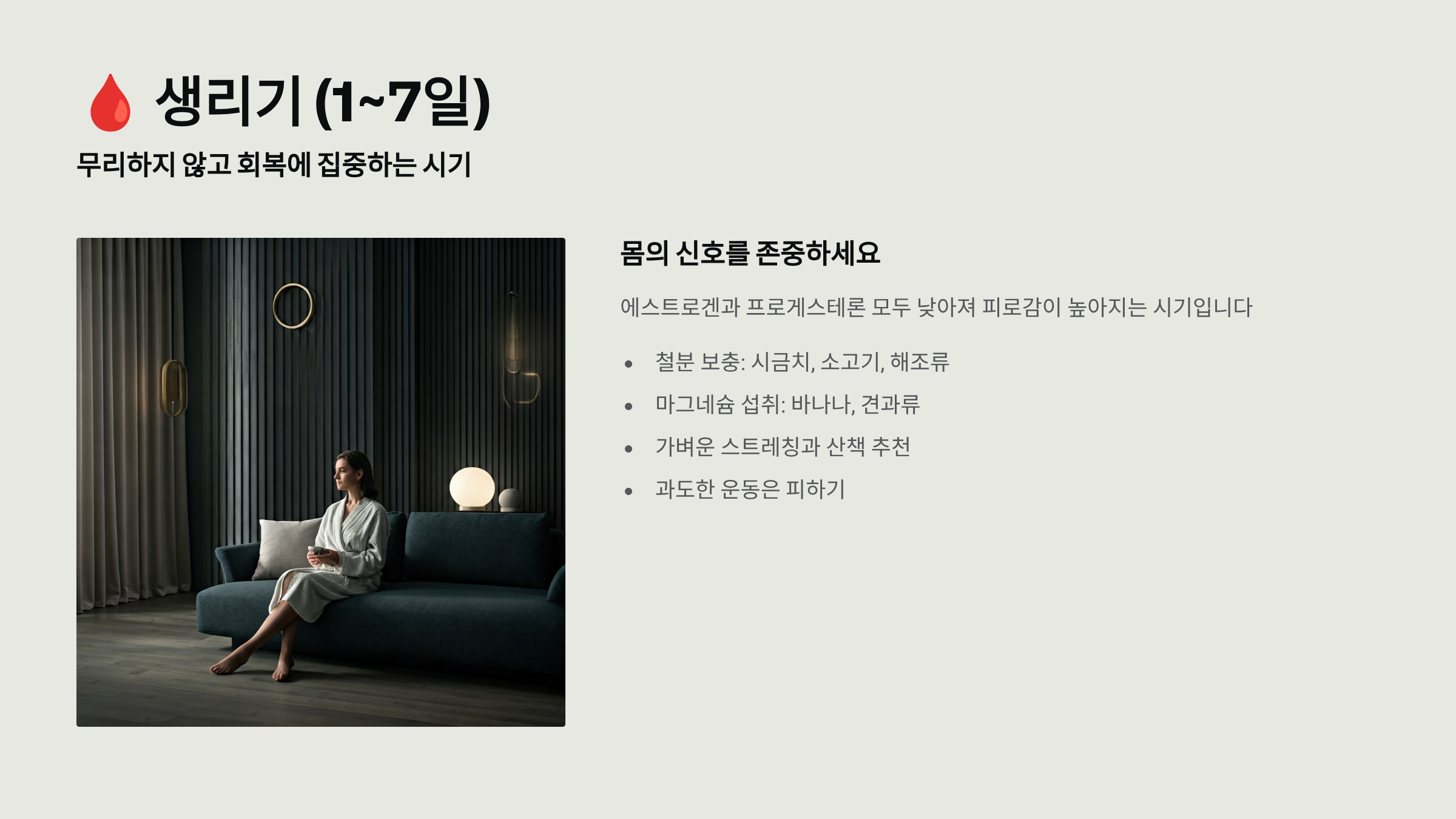 생리가 시작되는 첫째 날부터 약 7일간은 에스트로겐과 프로게스테론 수치가 모두 바닥을 치는 시기예요. 이때 몸은 자궁 내막을 배출하느라 에너지를 많이 소모하고, 철분 손실도 상당해요. 그래서 피로감이 밀려오고 운동할 의욕이 뚝 떨어지는 건 너무나 자연스러운 현상이랍니다. 😴