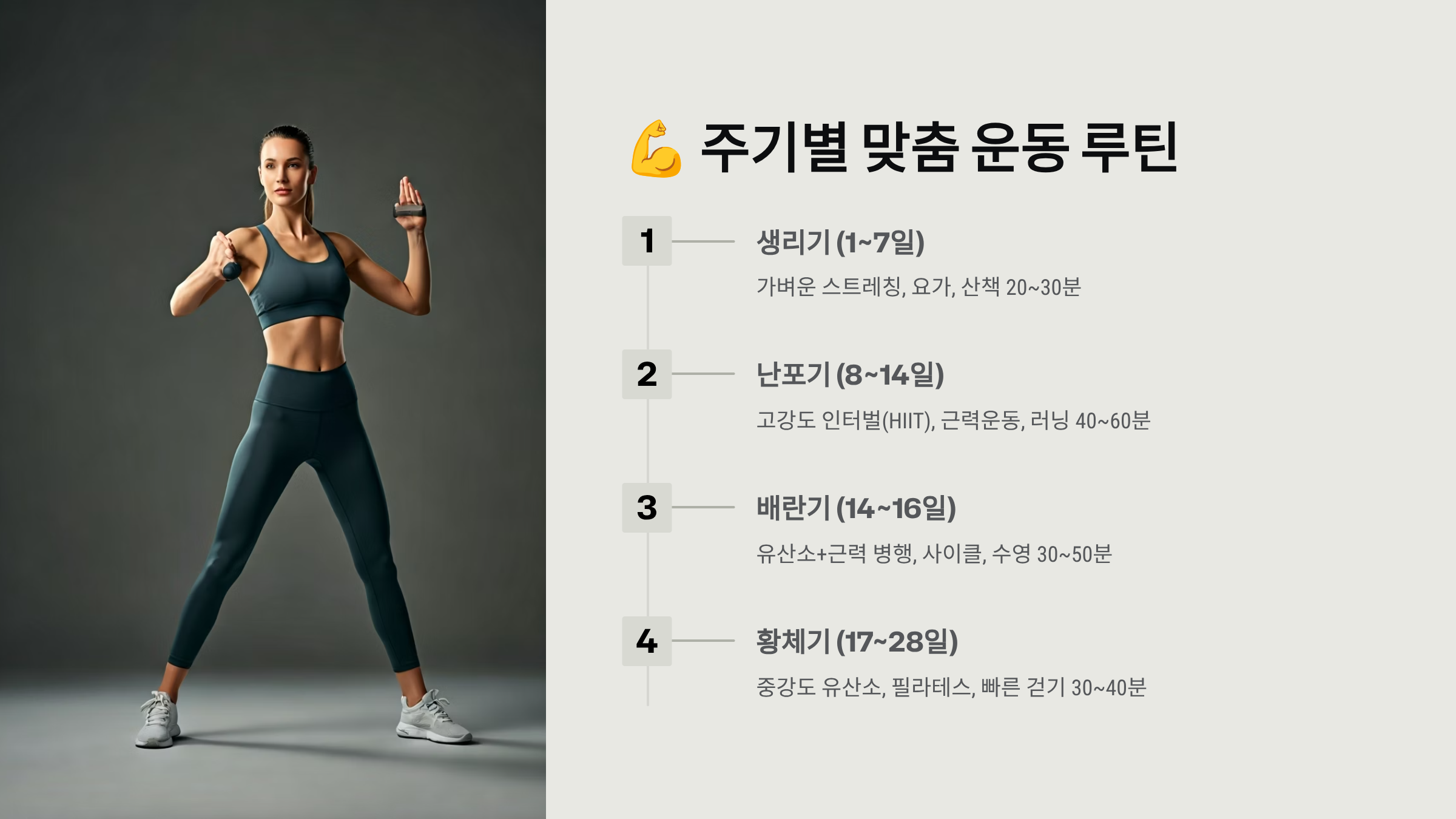 난포기(8~14일)는 운동의 황금기예요! 에스트로겐이 높아지면서 근육 합성이 활발해지고, 에너지 레벨도 최고조에 달해요. 이때 고강도 인터벌 트레이닝(HIIT), 웨이트 트레이닝, 크로스핏 같은 강도 높은 운동을 하면 최고의 결과를 얻을 수 있어요. 💥
