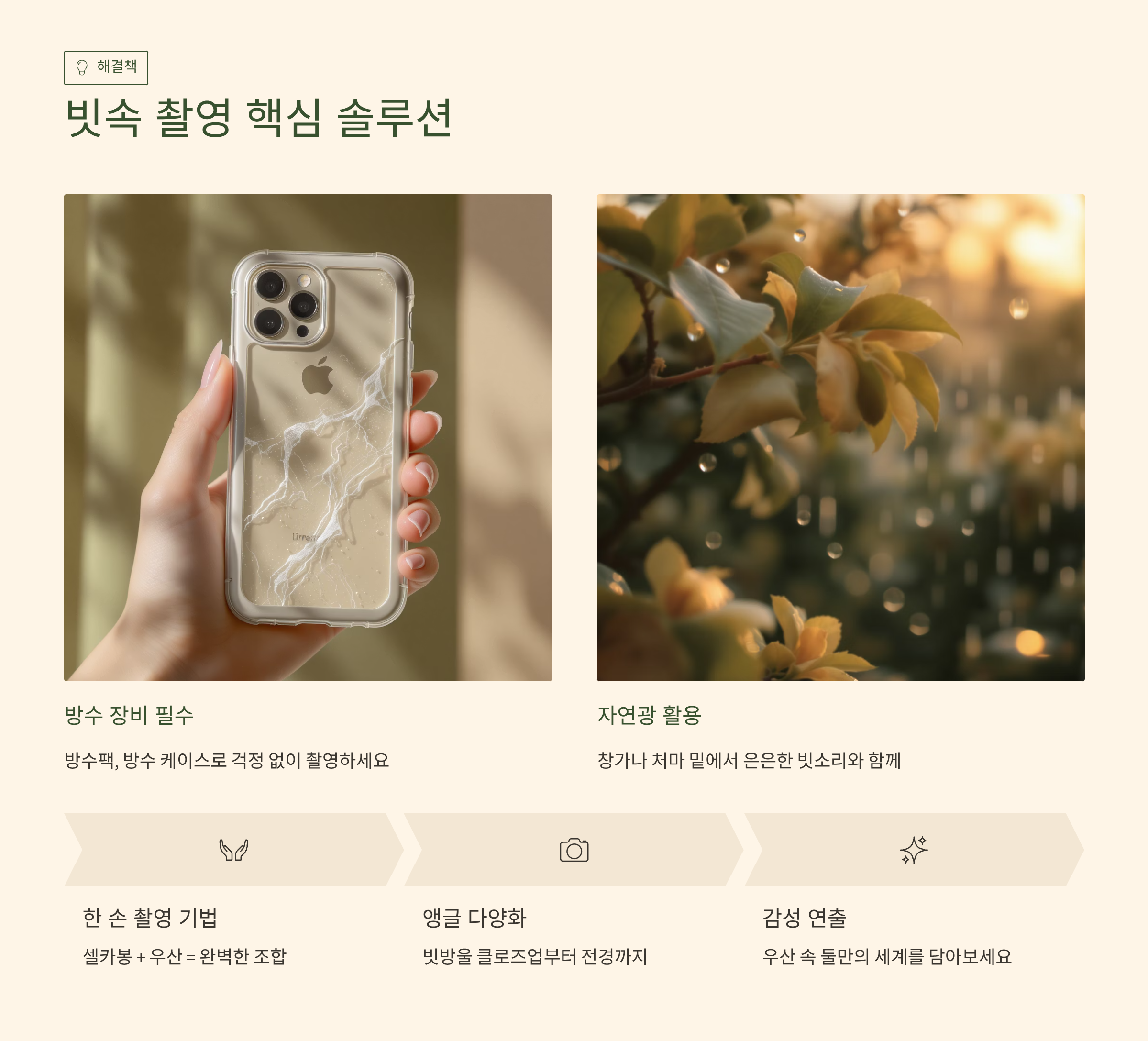 앞서 살펴본 문제점들을 하나씩 해결해 나가면 비 오는 날도 충분히 멋진 커플 브이로그를 제작할 수 있어요. 가장 먼저 장비 보호 문제를 해결해 볼게요. 방수 기능이 있는 액션캠을 활용하거나, 일반 카메라라면 방수 커버를 씌워서 촬영하는 방법이 있어요. 스마트폰의 경우에도 방수 케이스를 구비해 두면 비 오는 날 야외 촬영이 훨씬 수월해져요.