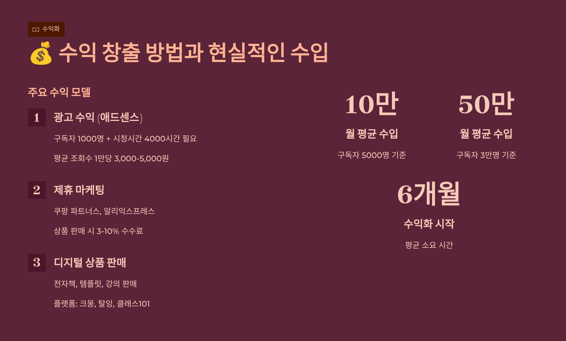 현실적인 수입에 대해 이야기하자면, 처음 1년은 수익이 거의 없거나 미미할 가능성이 높아요. 구독자 1000명, 시청시간 4000시간을 달성하는 데 평균적으로 6개월에서 1년 정도 걸리거든요. 그 후에도 월 광고 수익이 몇만 원에서 시작해서 서서히 늘어나는 경우가 대부분이에요. 급여를 대체할 수준의 수익을 올리려면 수년간의 꾸준한 노력이 필요해요.