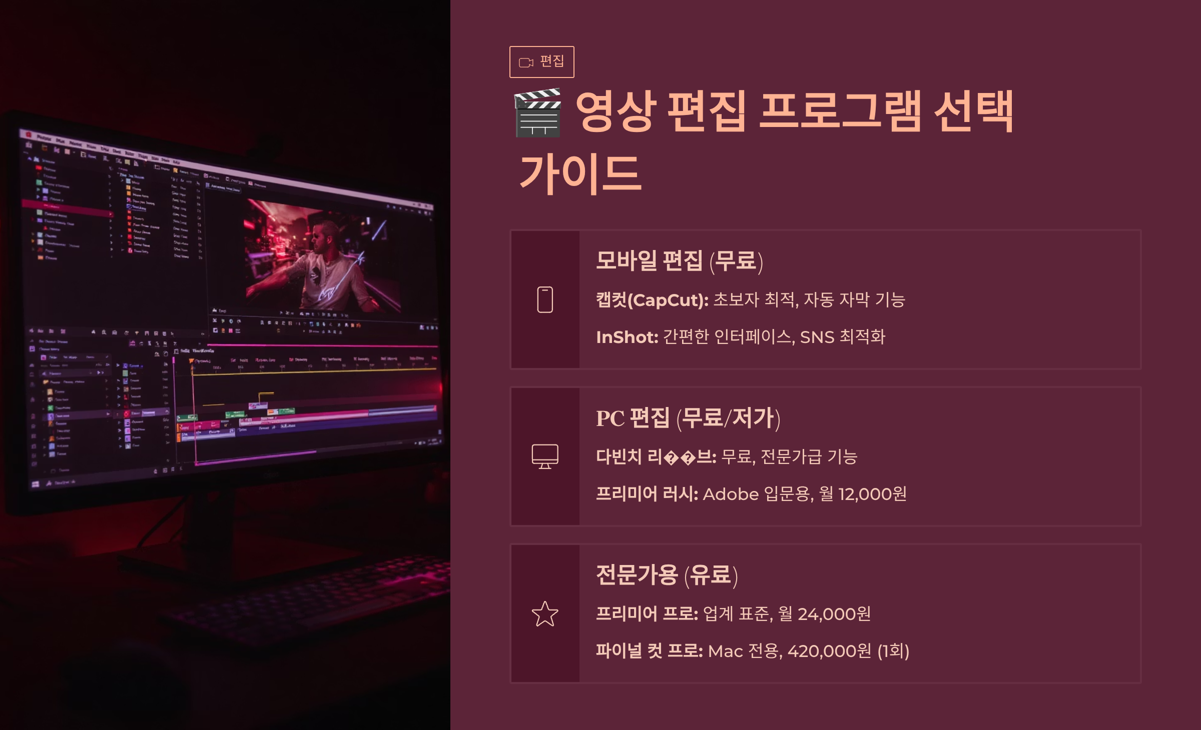 | 프리미어 프로 | 월 24,000원~ | 중간 | 전문 크리에이터 |