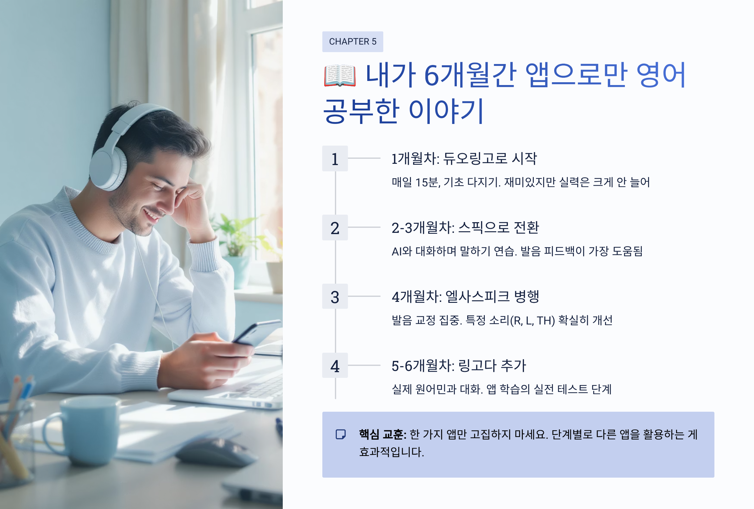 | 5개월차 | 스픽 프리토킹 집중 | AI와 자유 대화 | 3분 이상 대화 가능 |