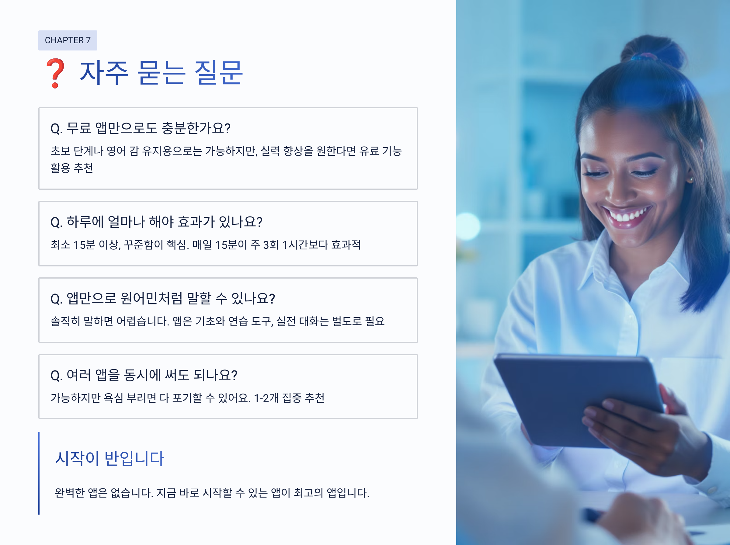 A30. 앱으로 기초를 다졌다면 실제 사람과의 대화 경험을 쌓아야 해요. 화상영어, 전화영어, 영어 스터디 모임 등을 통해 실전 경험을 쌓으세요. 해외여행이나 어학연수도 좋은 다음 단계예요. 앱은 출발점이지 종착점이 아니에요.