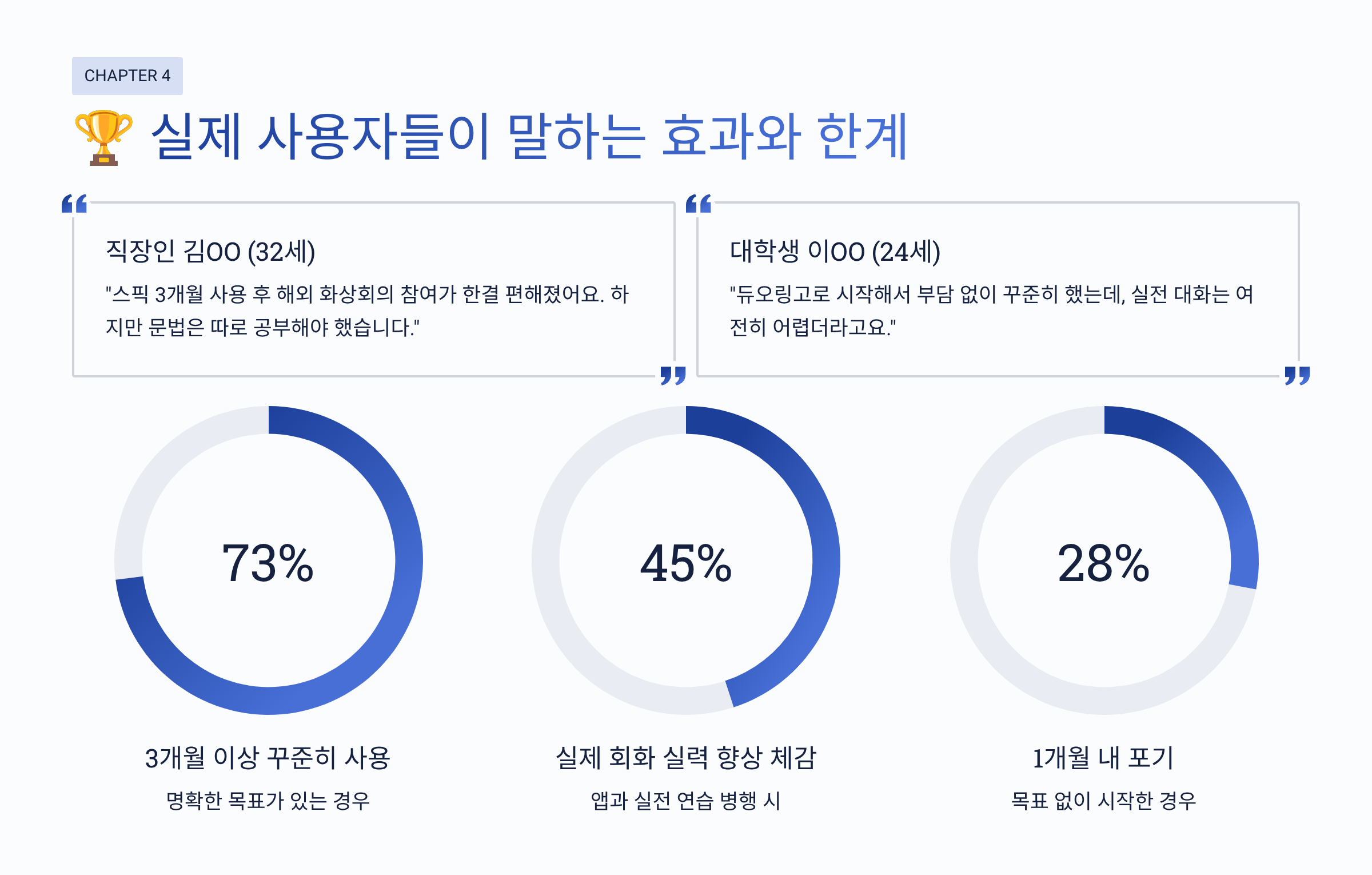 한계도 분명히 있었어요. 앱은 아무래도 실제 사람과의 대화를 완전히 대체하지는 못해요. AI가 아무리 발전해도 예측 불가능한 반응이나 감정적인 소통은 사람과 해야 해요. 앱으로 기초 체력을 기르고 실제 대화 경험을 쌓아가는 게 이상적인 조합이에요. 앱은 출발점이지 종착점이 아니에요.
